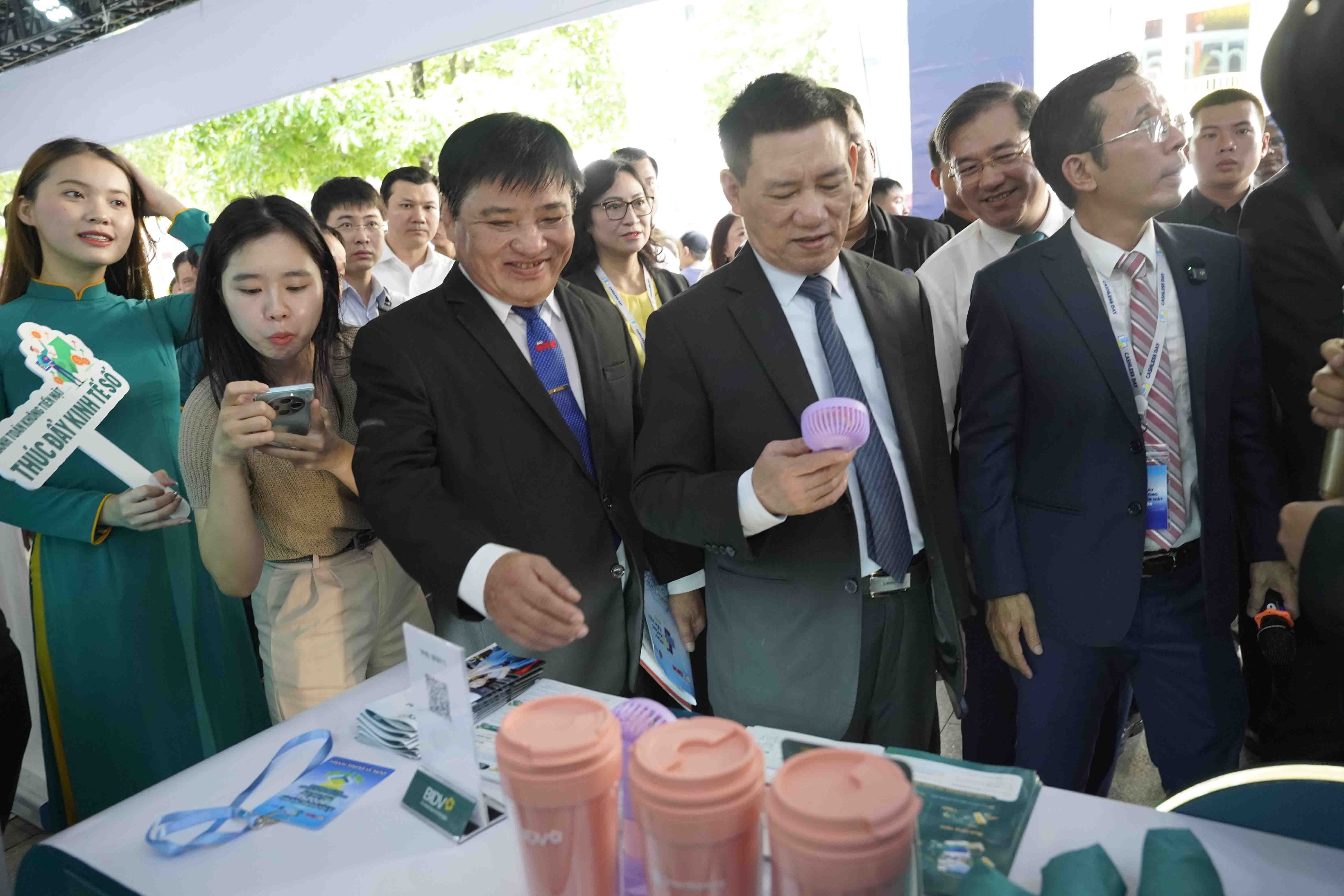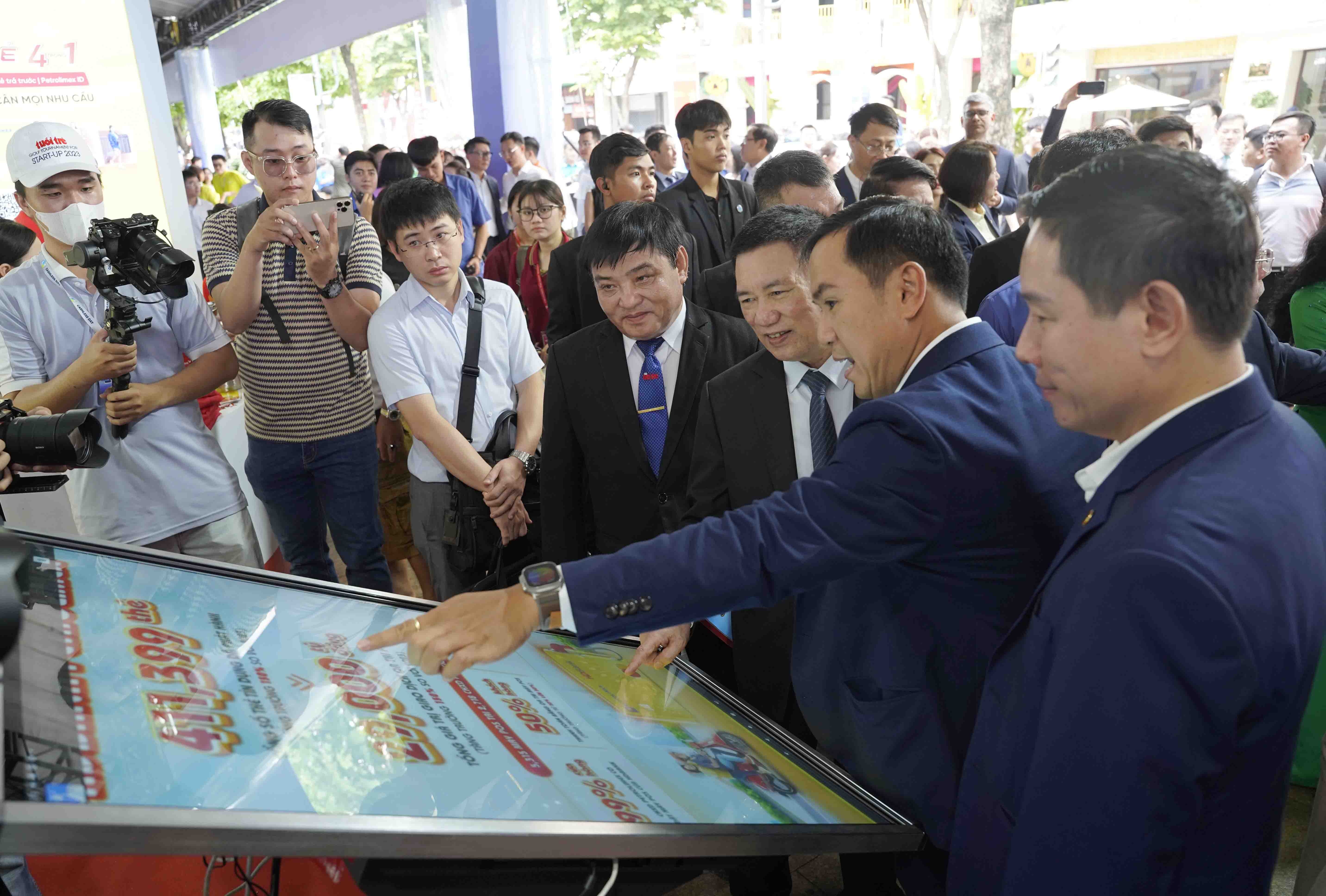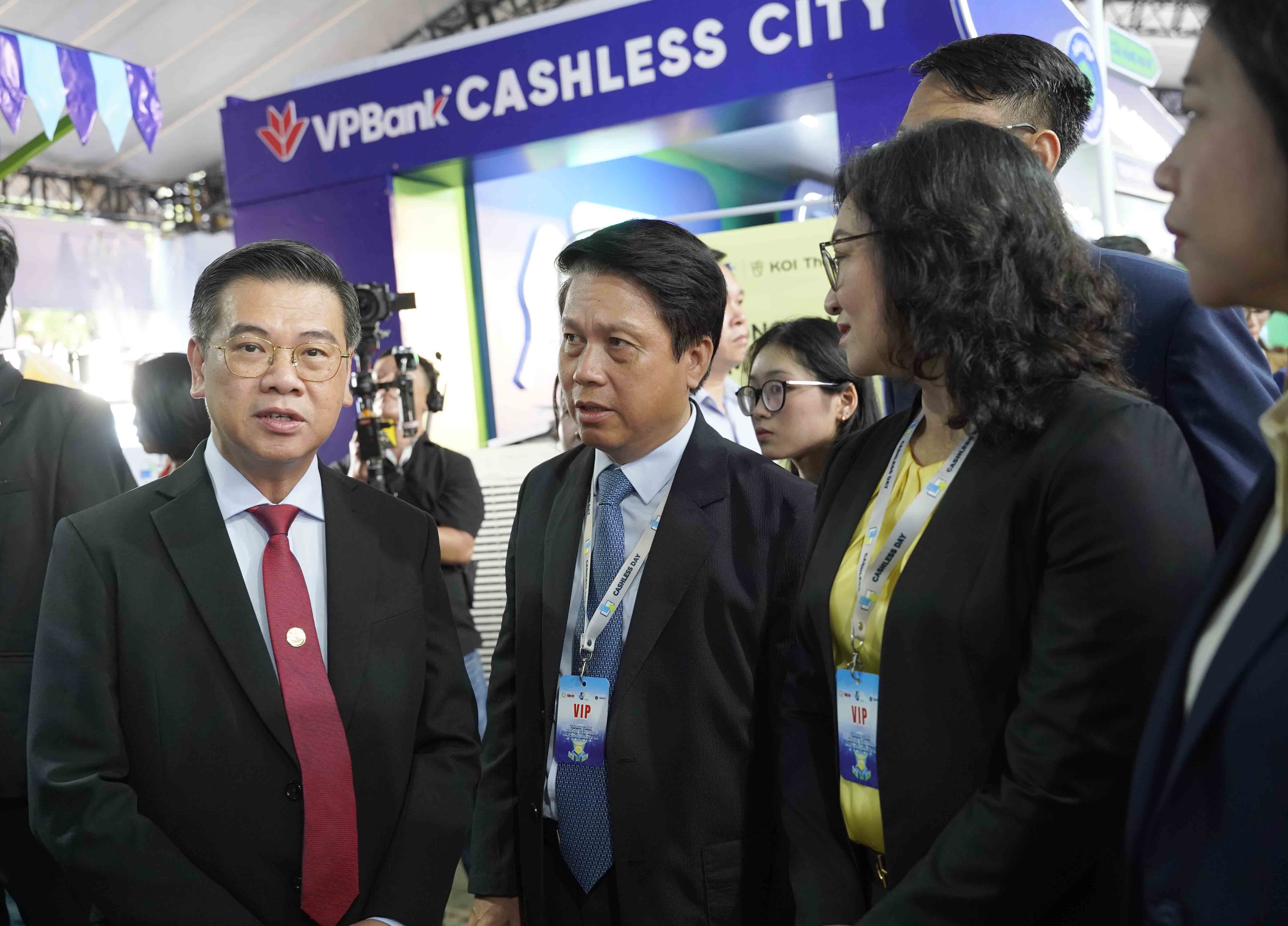 | Phó thủ tướng Hồ Đức Phớc thăm các gian hàng giới thiệu công nghệ mới của ngân hàng thương mại có vốn nhà nước chi phối - Ảnh: Đình Hải |