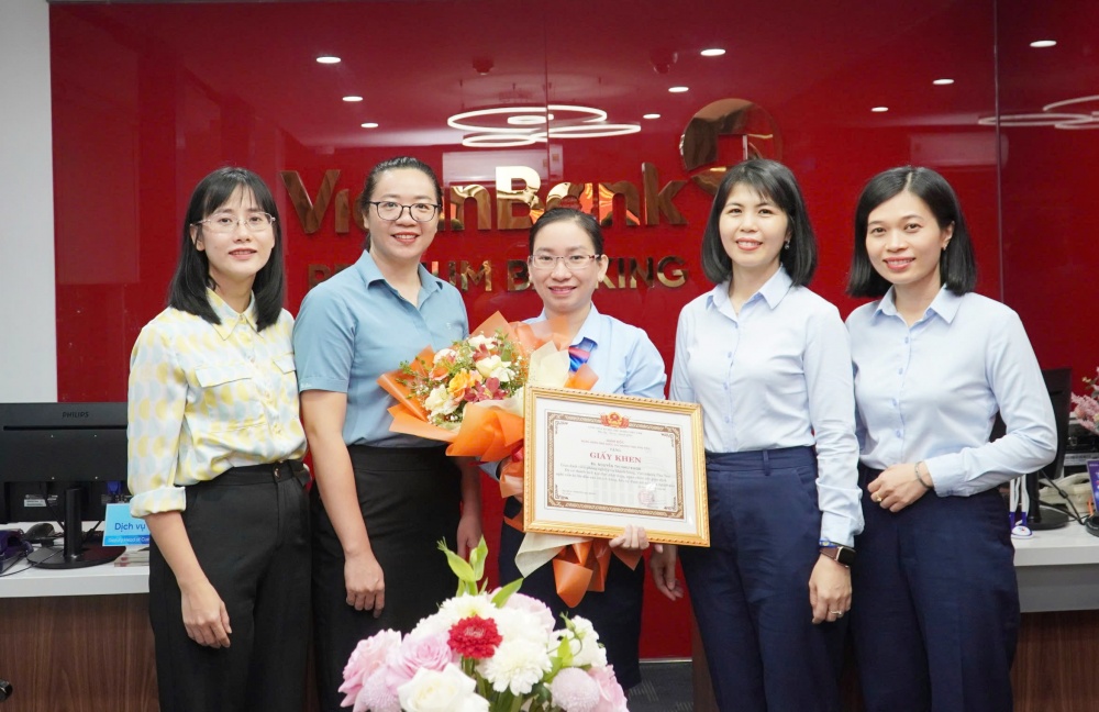 | Bà Đỗ Thị Bích Diệu, Phó Giám đốc NHNN chi nhánh Phú Yên (thứ 2 từ trái sang) trao giấy khen cho giao dịch viên Nguyễn Thị Như Khoa. |