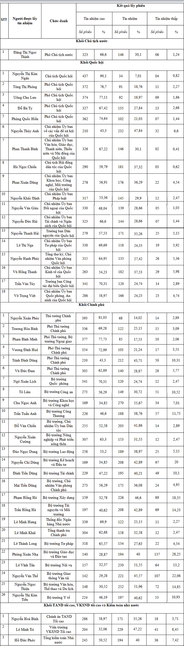 Quốc hội công bố kết quả lấy phiếu tín nhiệm