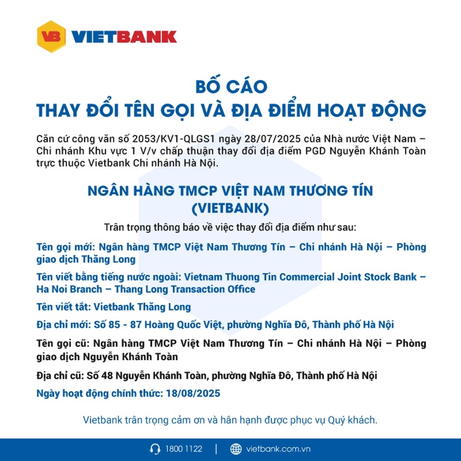 Vikki Bank - Chi nhánh Hà Nội thông báo thay đổi địa điểm PGD Kim Liên và đổi tên thành PGD Hà Thành