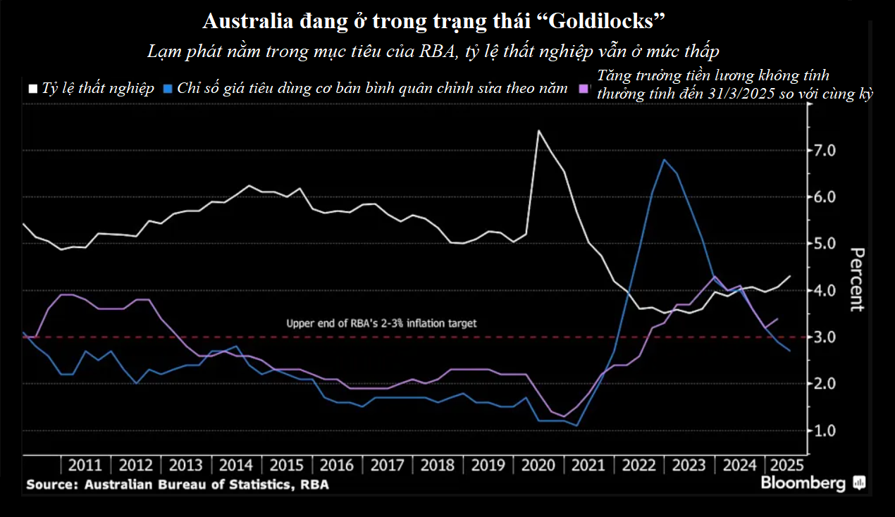 Một số dấu hiệu ban đầu cho thấy thị trường lao động Australia đang yếu đi, với tỷ lệ thất nghiệp tăng lên 4,3% trong tháng 6, mức cao nhất trong bốn năm. Triển vọng cũng bị che mờ bởi chính sách bảo hộ thương mại của chính quyền Trump, căng thẳng quốc tế gia tăng và nhu cầu từ Trung Quốc chậm lại.