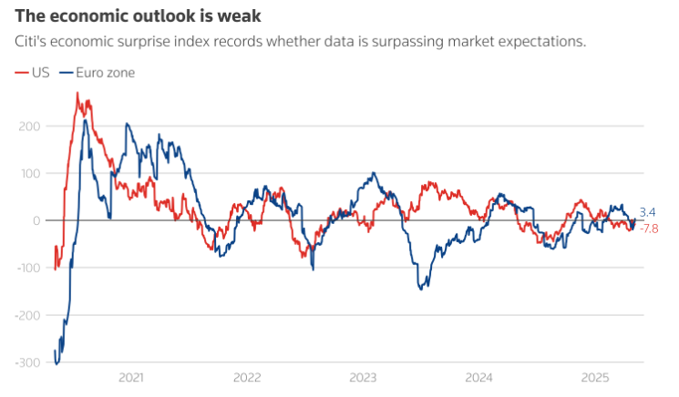 Sự khác biệt giữa các dữ liệu kinh tế mềm (ví dụ như chỉ số tâm lý và dữ liệu kinh tế cứng (ví dụ như số liệu việc làm) đã khiến việc giải mã rủi ro suy thoái trở nên khó khăn. Chẳng hạn số liệu việc làm mới nhất của Mỹ cho thấy nền kinh tế lớn nhất thế giới vẫn rất mạnh, thế nhưng sự suy giảm kinh tế trong quý đầu tiên tại Mỹ và sự mở rộng ở khu vực đồng euro đều được giải thích là do các công ty “chạy trước” các mức thuế quan.