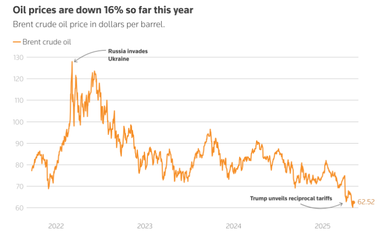 Tín hiệu từ thị trường hàng hóa cũng chỉ ra sự suy giảm mạnh của kinh tế toàn cầu. Theo đó, giá dầu đã giảm khoảng 16% trong năm nay xuống còn khoảng 60 USD/thùng. Nếu tình trạng này tiếp diễn, năm 2025 sẽ là năm tồi tệ nhất đối với dầu thô kể từ cuộc khủng hoảng Covid năm 2020.