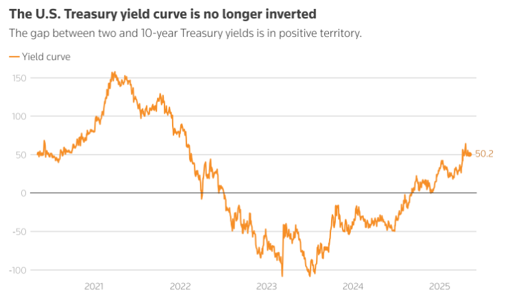 | Khoảng cách giữa lợi suất trái phiếu kho bạc kỳ hạn 10 năm và 2 năm đang ở mức dương |