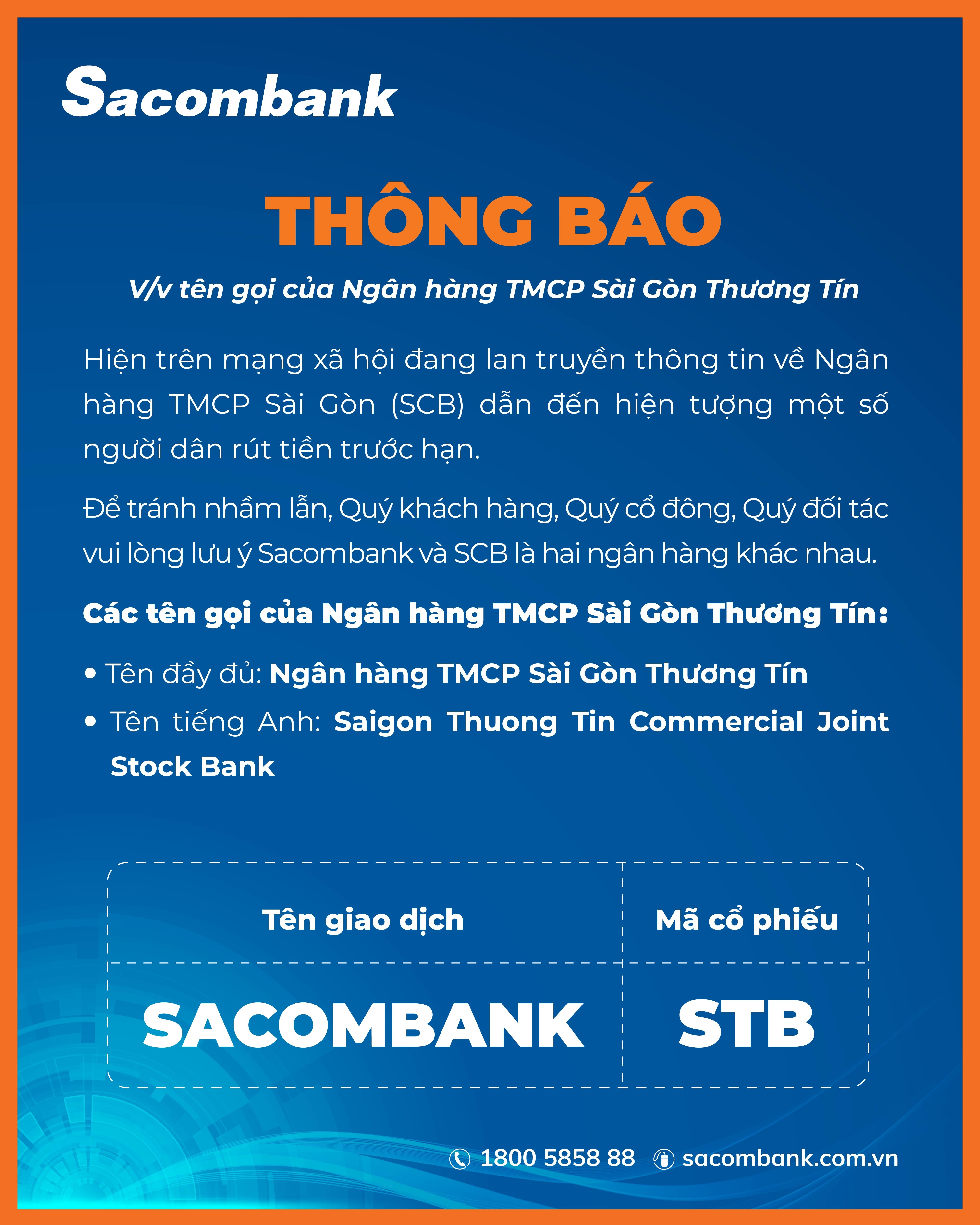 Theo Ngân hàng TMCP Sài Gòn Thương Tín (Sacombank), hiện trên mạng xã hội đang lan truyền thông tin về Ngân hàng TMCP Sài Gòn (SCB) dẫn đến hiện tượng một số người dân rút tiền trước hạn.