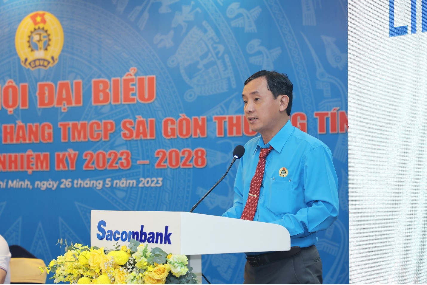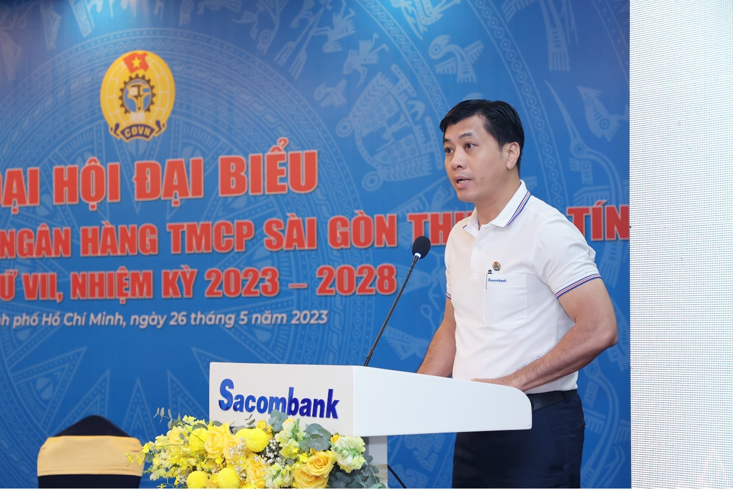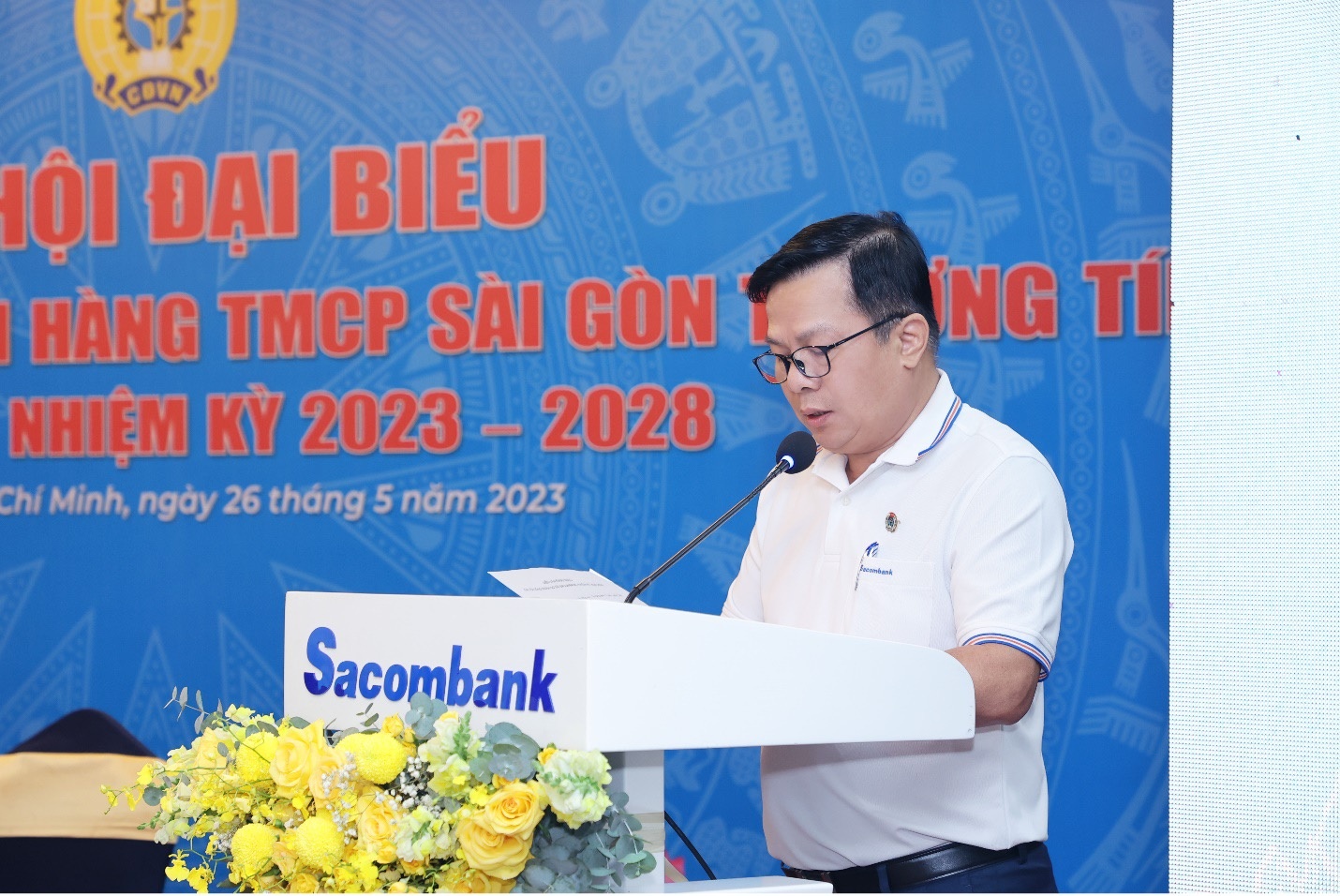 | Ông Đào Nguyên Vũ – Đại diện Đoàn Chủ tịch báo cáo Tổng kết hoạt động CĐCS Sacombank (nhiệm kỳ 2019 - 2023) và Phương hướng hoạt động CĐCS nhiệm kỳ 2023 - 2028. |