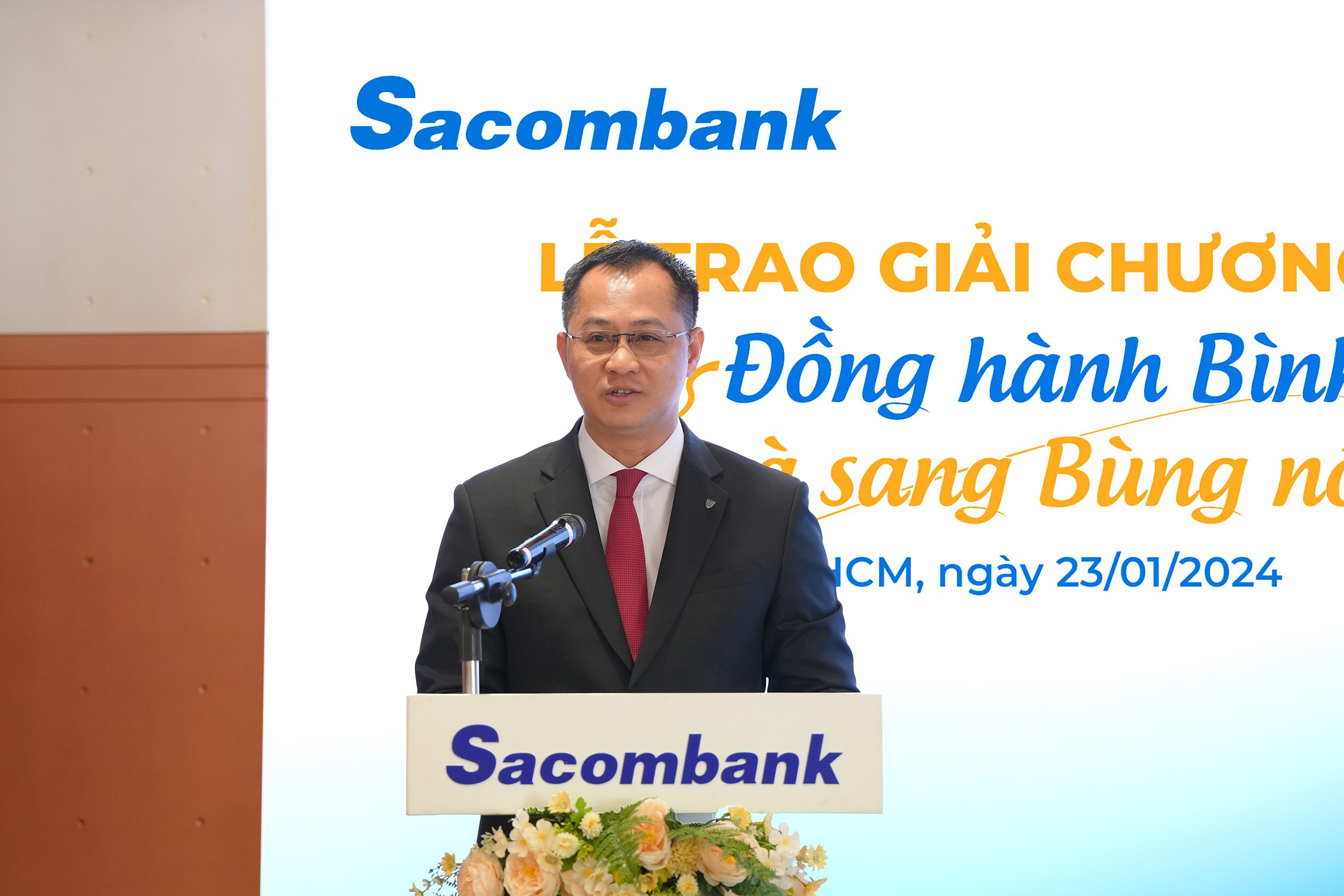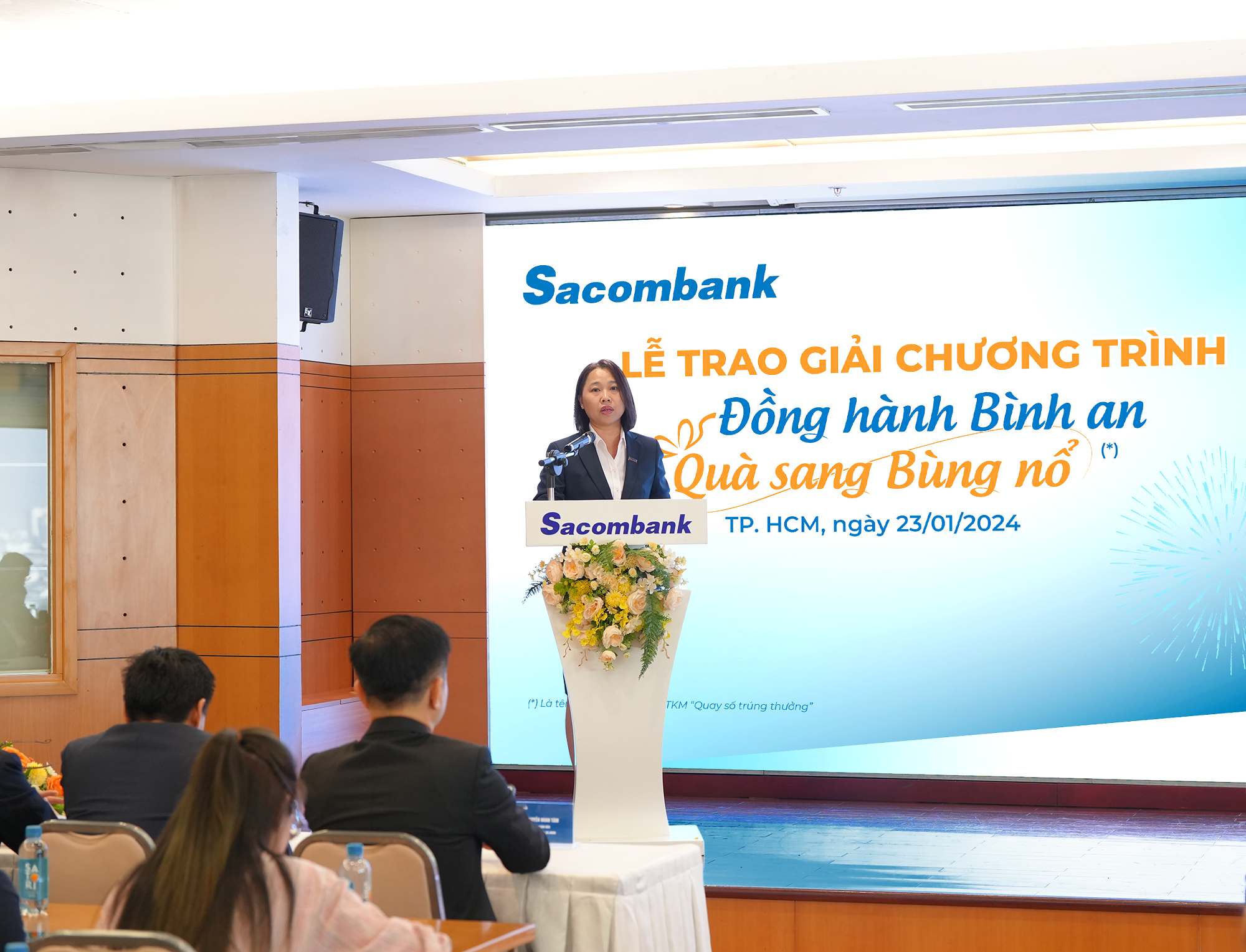 | Bà Nguyễn Phương Huyền – Phó Giám đốc Khối Cá nhân Sacombank phát biểu và chúc mừng các khách hàng trúng giải chương trình “Đồng hành bình an – Quà sang bùng nổ” |