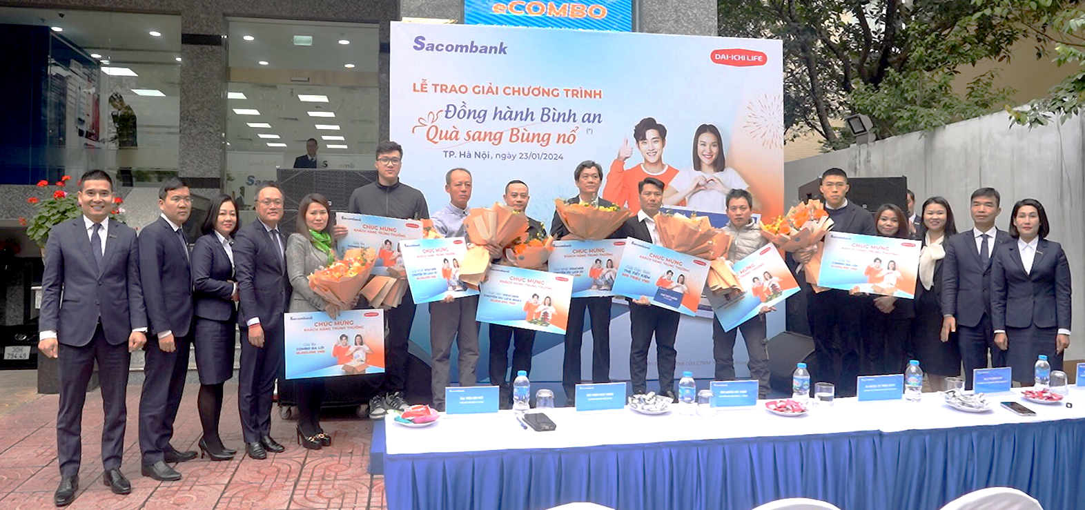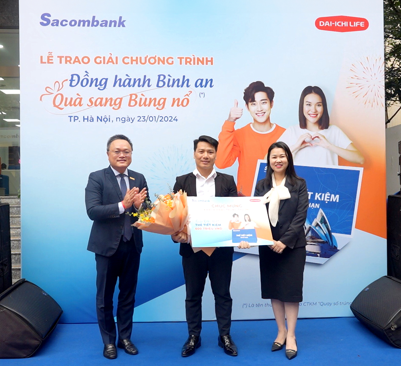 Chương trình quay số trúng thưởng“Đồng hành bình an – Quà sang bùng nổ”được Sacombank và Dai-ichi Life Việt Nam triển khai dành cho khách hàng tham gia hợp đồng bảo hiểm nhân thọ mới từ ngày 04/10/2023 đến 31/12/2023 với tổng giá trị giải thưởng gần 3 tỷ đồng, gồm 1 giải đặc biệt là thẻ tiết kiệm 600 triệu đồng, 18 giải nhất là voucher du lịch Úc trị giá 60 triệu đồng/giải, 20 giải nhì là voucher du lịch Nhật Bản trị giá 35 triệu đồng/giải và 27 giải ba là Combo Đa Lợi Sacombank (gồm tài khoản thanh toán, thẻ thanh toán, Ngân hàng điện tử/Sacombank Pay, thông báo giao dịch qua ứng dụng Mobile Banking/Sacombank Pay) có 20 triệu đồng trong tài khoản thanh toán.