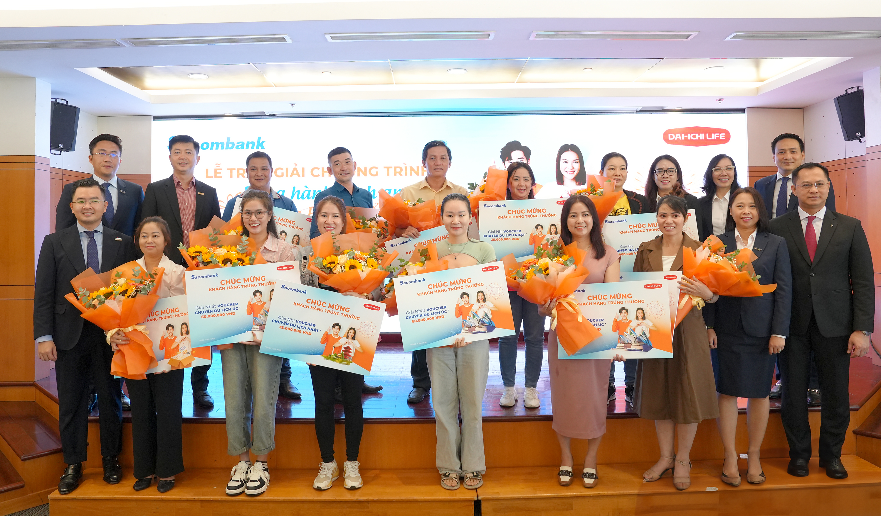| Đại diện lãnh đạo Sacombank và Dai-ichi Life VN chúc mừng các khách hàng trúng thưởng tại TP.HCM |