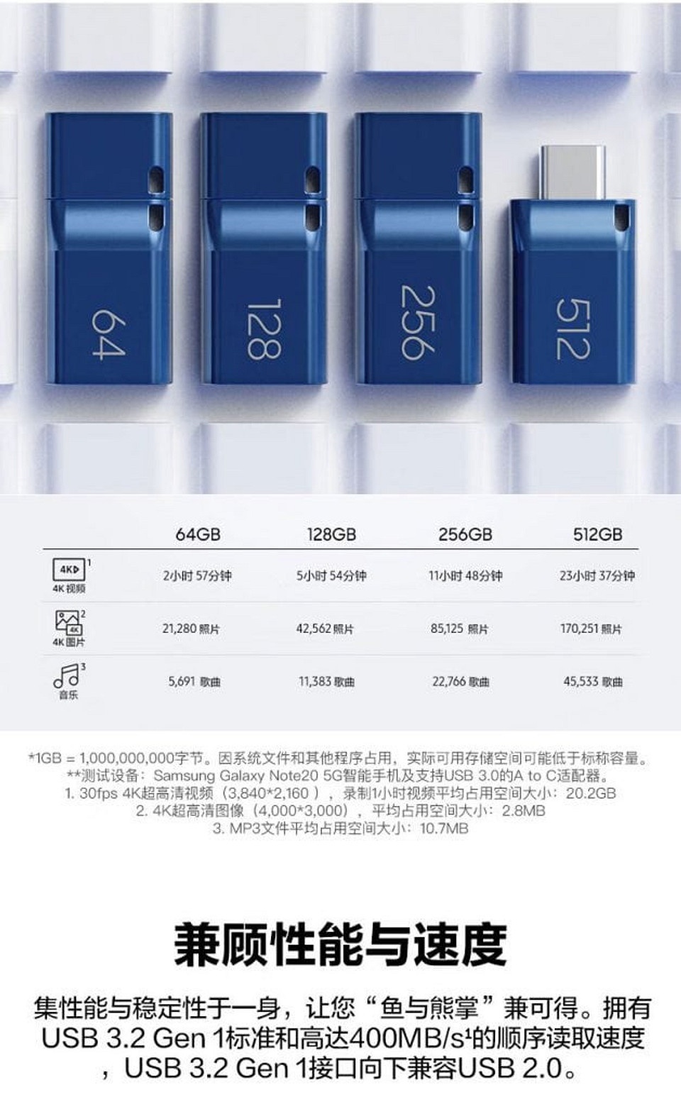Theo công bố, ổ USB flash USB-C này sử dụng chuẩn USB 3.2 Gen 1, mang đến tốc độ đọc lên đến 400MB/s, cho phép truyền dữ liệu nhanh chóng, chẳng hạn như nó có thể sao chép 1 video 4K dung lượng 4GB chỉ trong 9 giây. Phiên bản 64GB có tốc độ đọc thấp hơn một chút, đạt mức tối đa 300MB/s. Sản phẩm cũng tương thích ngược với USB 2.0 để hỗ trợ các thiết bị không hỗ trợ chuẩn mới.