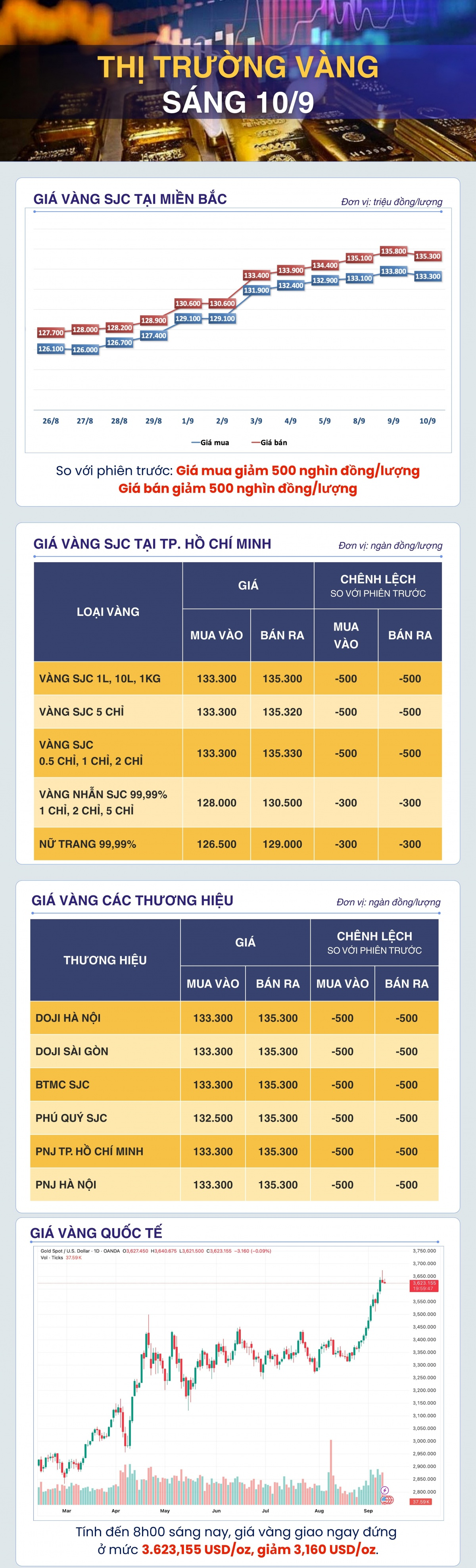 Sáng 10/9: Giá vàng thế giới quay đầu giảm