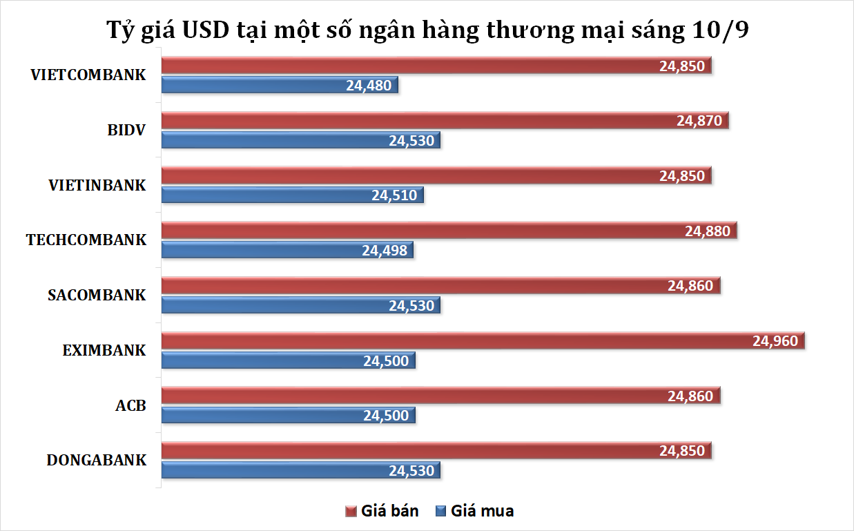 Cụ thể, tính đến 9h sáng nay, giá mua USD thấp nhất đang ở mức 24.480 VND/USD (cao hơn 130 đồng), giá mua cao nhất đang ở mức 24.530 VND/USD (cao hơn 60 đồng). Ở chiều bán ra, giá bán USD thấp nhất đang ở mức 24.850 VND/USD (cao hơn 80 đồng), giá mua cao nhất đang ở mức 24.960 VND/USD (cao hơn 90 đồng).