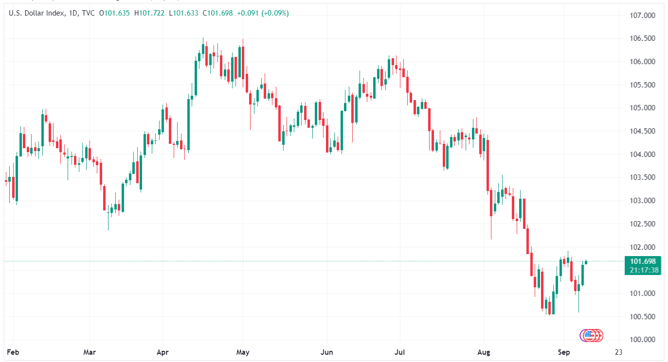 Chỉ số đô la Mỹ (DXY), đo lường biến động của bạc xanh so với 6 đồng tiền chủ chốt (EUR, JPY, GBP, CAD, SEK, CHF), hiện ở mức 101,698 điểm, tăng 0,091 điểm so với thời điểm mở cửa.