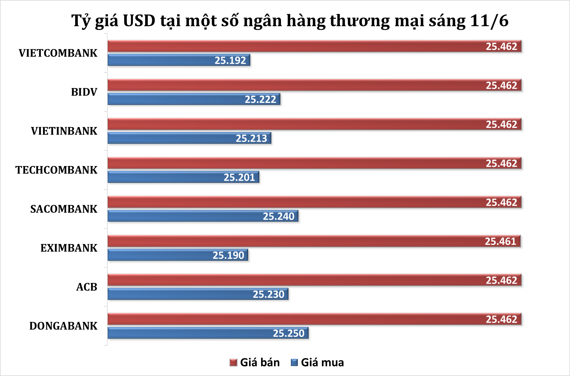 Cụ thể, tính đến 9h sáng nay, giá mua USD thấp nhất đang ở mức 25.190 VND/USD (cao hơn 20 đồng), giá mua cao nhất đang ở mức 25.250 VND/USD (cao hơn 10 đồng). Ở chiều bán ra, giá bán USD được hầu hết các ngân hàng niêm yết ở mức 25.462 VND/USD (cao hơn 8 đồng).