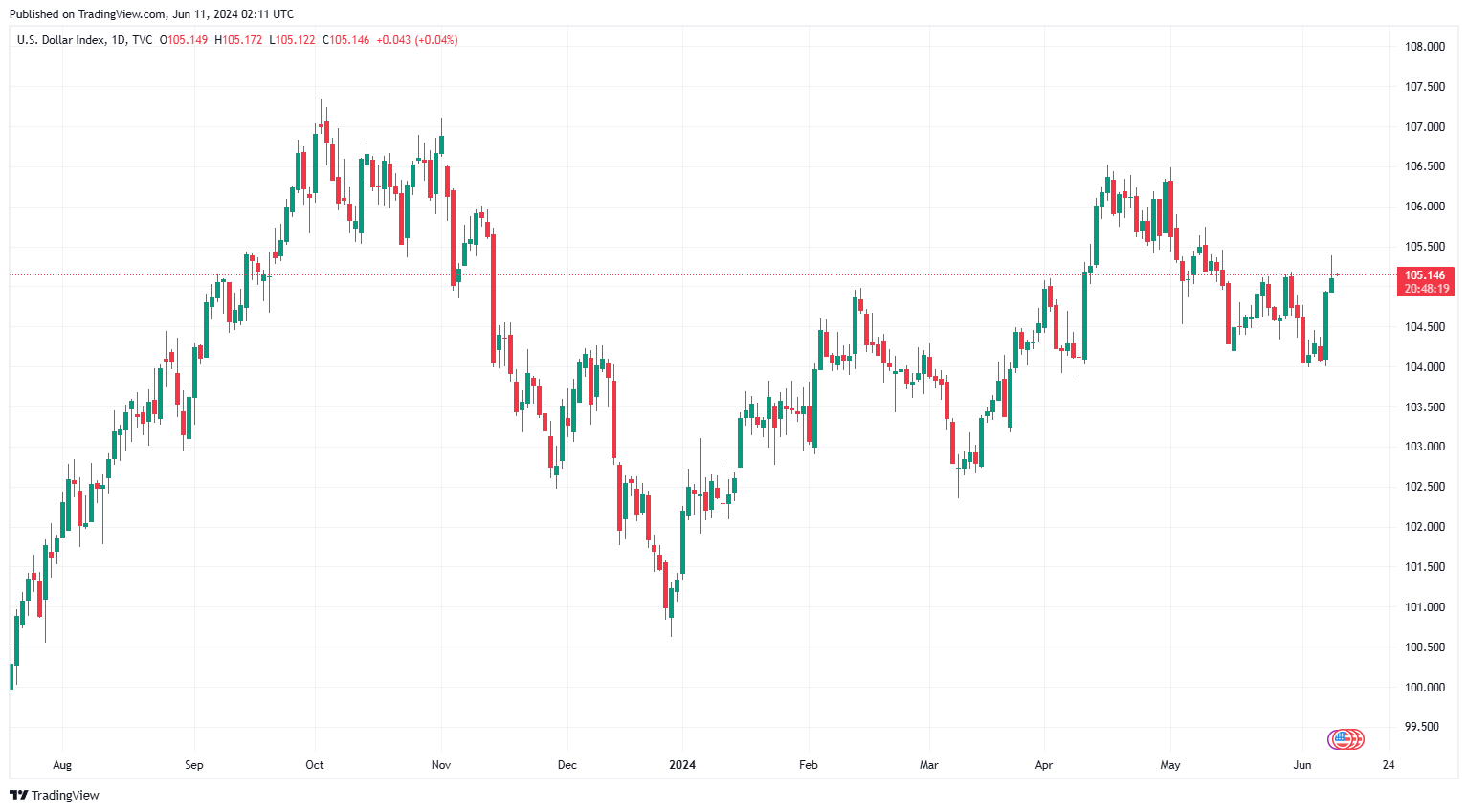 Chỉ số đô la Mỹ (DXY), đo lường biến động của bạc xanh so với 6 đồng tiền chủ chốt (EUR, JPY, GBP, CAD, SEK, CHF), hiện ở mức 105,146 điểm, giảm 0,004 điểm so với thời điểm mở cửa.