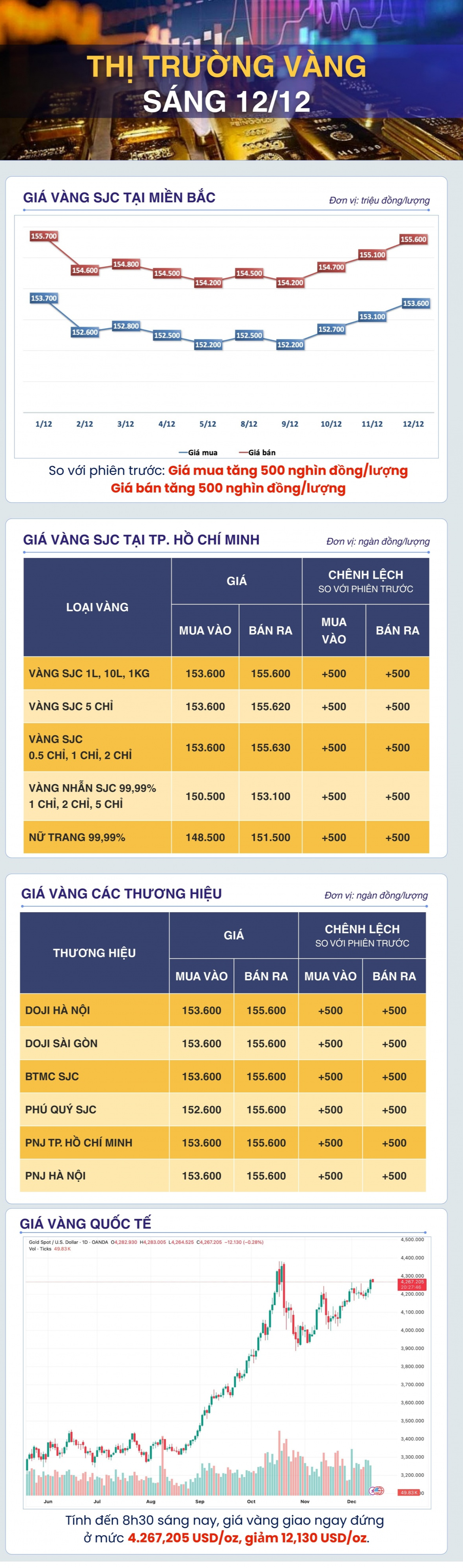Tính đến cuối phiên hôm qua, giá vàng giao ngay tăng 1,2% lên 4.280,08 USD/oz, đạt mức cao nhất kể từ ngày 21/10. Giá vàng tương lai tháng 2 tăng 2,1% lên 4.313 USD/oz.