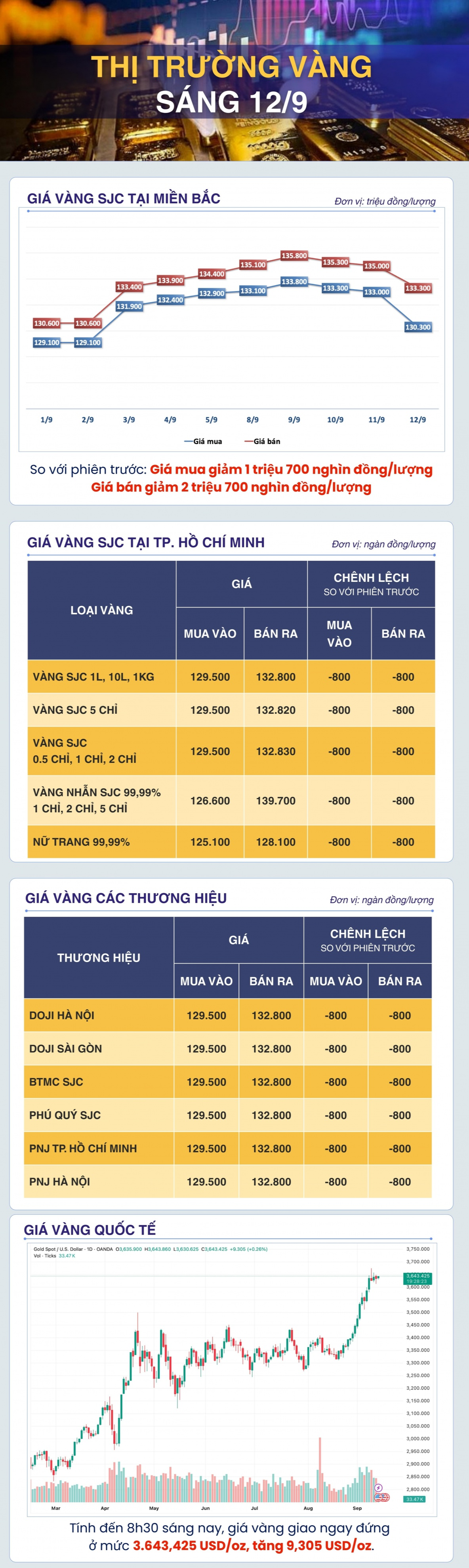 Kết thúc phiên giao dịch ngày 12/9 (giờ Mỹ), giá vàng giao ngay giảm 0,2% xuống 3.632,49 USD/oz, sau khi chạm mức kỷ lục 3.673,95 USD hôm thứ Ba. Giá vàng tương lai tháng 12 giảm 0,2%, chốt phiên ở 3.673,60 USD/oz.