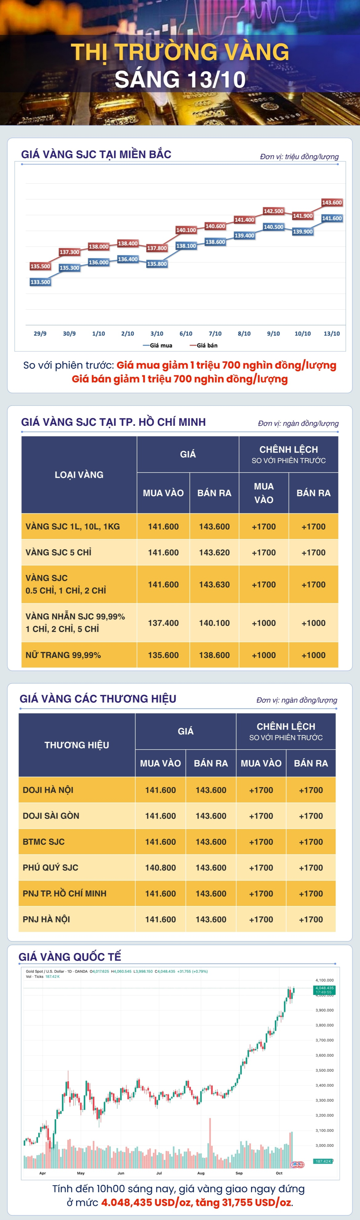 Sáng 13/10: Giá vàng tăng trong sáng đầu tuần