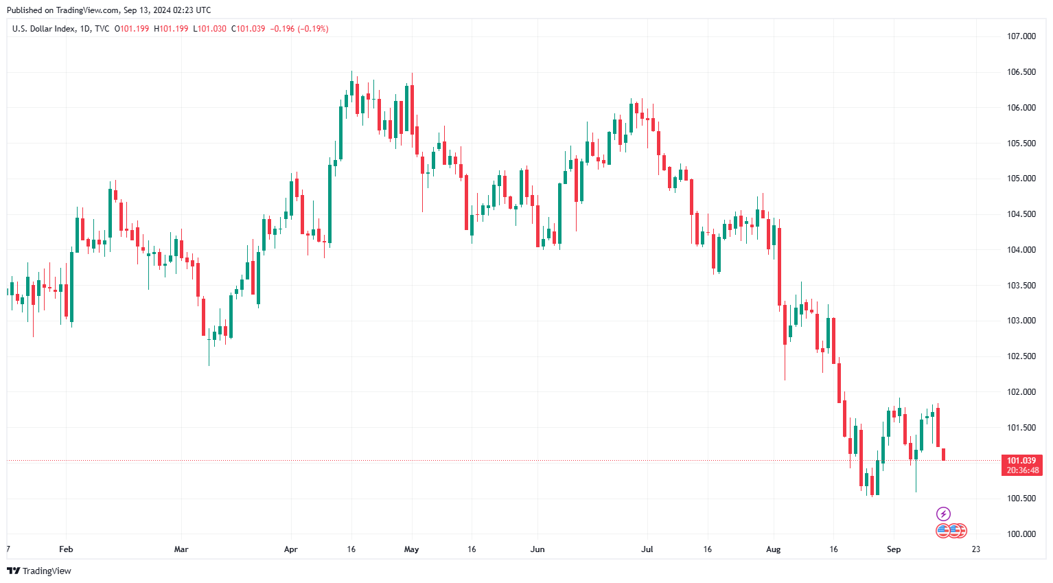 Chỉ số đô la Mỹ (DXY), đo lường biến động của bạc xanh so với 6 đồng tiền chủ chốt (EUR, JPY, GBP, CAD, SEK, CHF), hiện ở mức 101,039 điểm, giảm 0,161 điểm so với thời điểm mở cửa.