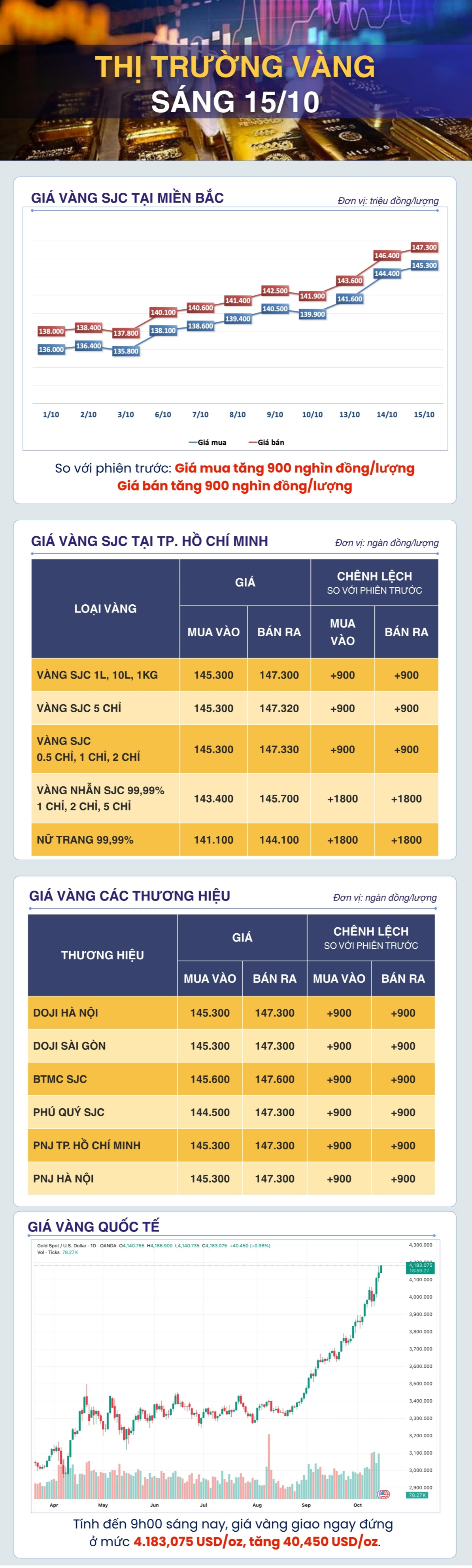 Trong phiên hôm qua, giá vàng tiếp tục lập kỷ lục mới, vượt ngưỡng 4.100 USD/oz, nhờ kỳ vọng Cục Dự trữ Liên bang Mỹ (Fed) sẽ cắt giảm lãi suất trong tháng này và dòng tiền tìm đến tài sản an toàn sau khi căng thẳng thương mại giữa Washington và Bắc Kinh bùng phát trở lại.