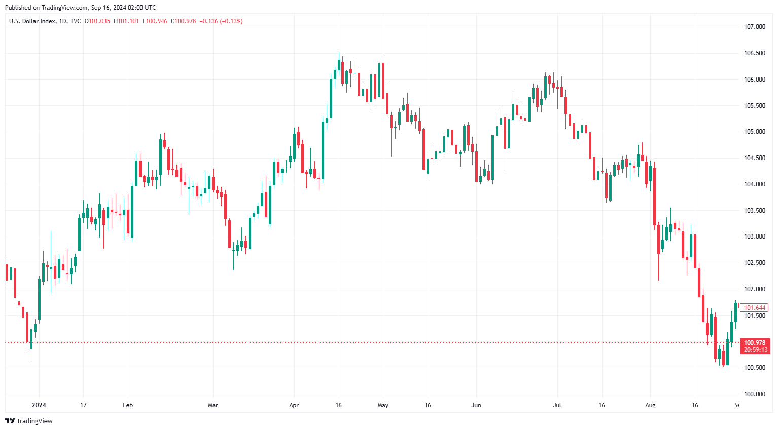 Chỉ số đô la Mỹ (DXY), đo lường biến động của bạc xanh so với 6 đồng tiền chủ chốt (EUR, JPY, GBP, CAD, SEK, CHF), hiện ở mức 100,978 điểm, giảm 0,062 điểm so với thời điểm mở cửa.