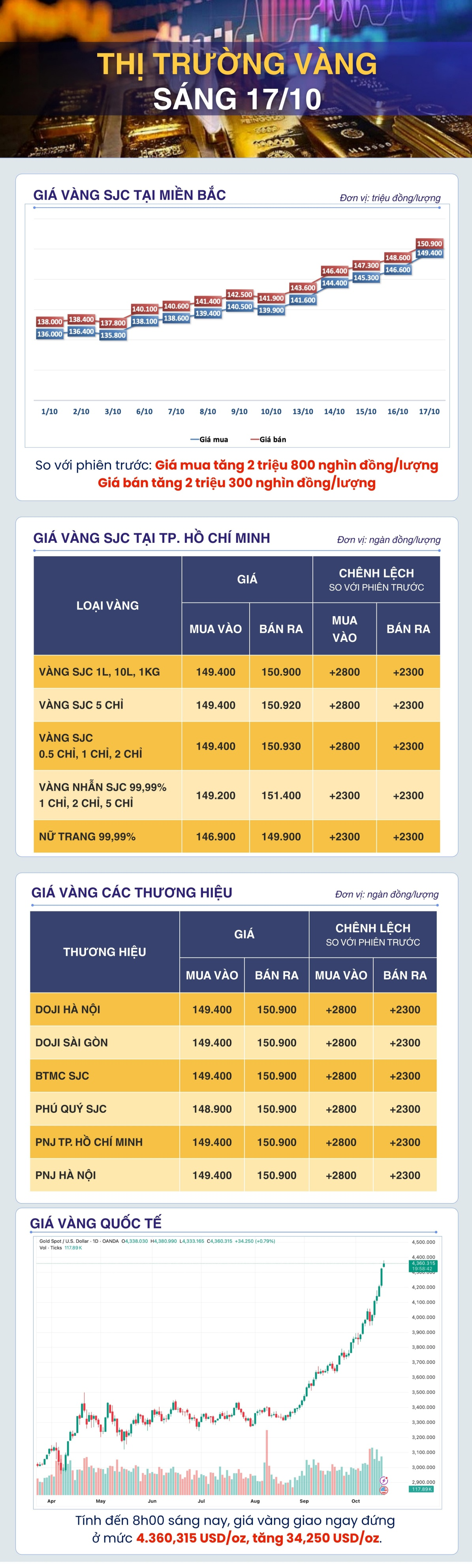Trong phiên hôm qua, giá vàng thế giới tiếp tục phá kỷ lục, vượt mốc 4.300 USD/oz lần đầu tiên trong lịch sử, đồng thời cũng là phiên thứ 4 liên tiếp giá kim loại quý chạm các mức kỷ lục mới, khi nhà đầu tư đổ xô tìm đến tài sản trú ẩn an toàn trước căng thẳng thương mại Mỹ - Trung leo thang và tình trạng chính phủ Mỹ tiếp tục đóng cửa. Bên cạnh đó, kỳ vọng Fed sẽ cắt giảm lãi suất trong thời gian tới đã tiếp thêm đà tăng cho kim loại quý này.