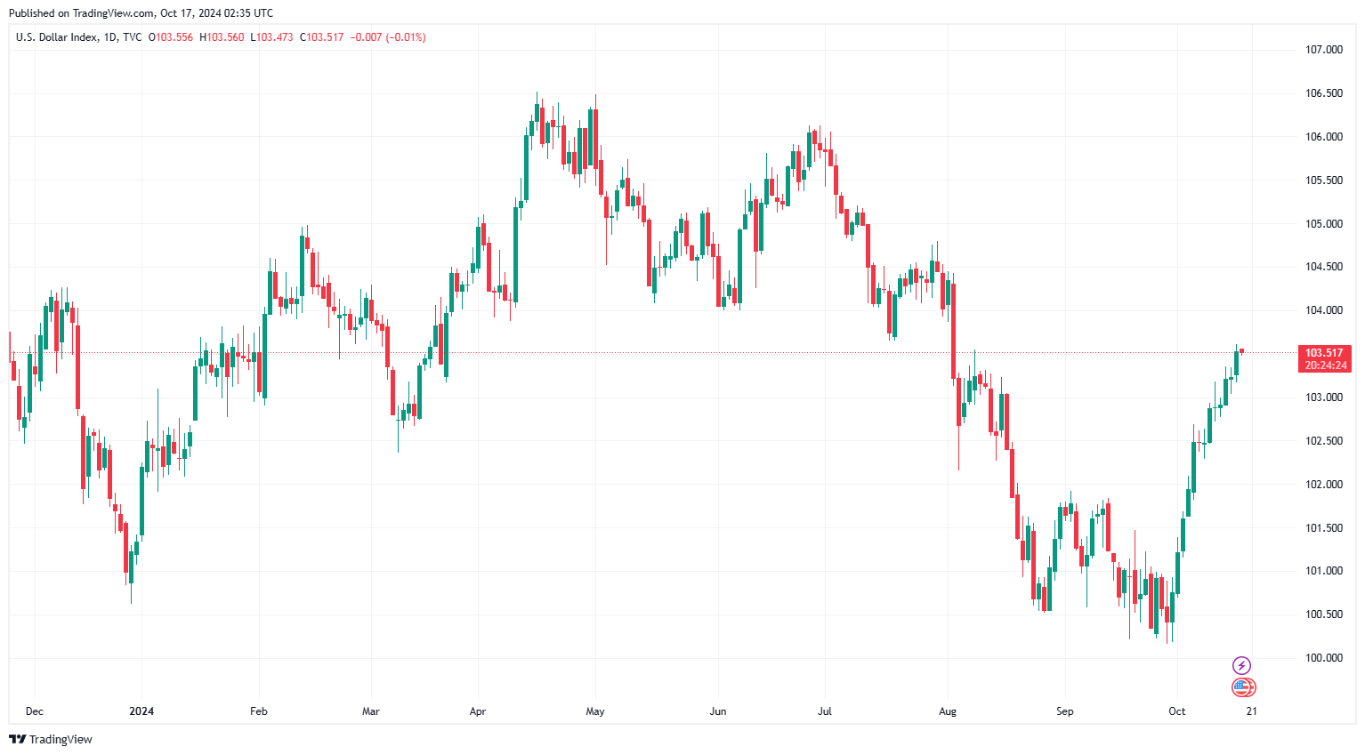 Đồng bạc xanh duy trì ở mức cao nhất trong 11 tuần, không chỉ được hỗ trợ bởi một loạt dữ liệu lạc quan về nền kinh tế Mỹ khiến các nhà giao dịch giảm kỳ vọng về việc Cục Dự trữ Liên bang Mỹ (Fed) cắt giảm lãi suất, mà còn nhờ vào khả năng ứng cử viên tổng thống đảng Cộng hòa Donald Trump giành chiến thắng trong cuộc bầu cử tổng thống Mỹ vào tháng 11.