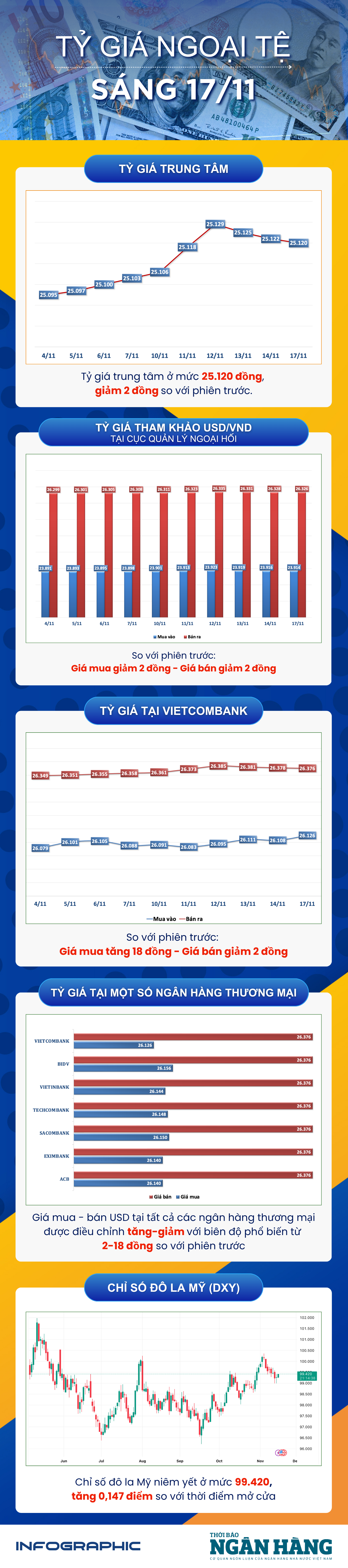 Sáng 17/11: Tỷ giá trung tâm giảm 2 đồng
