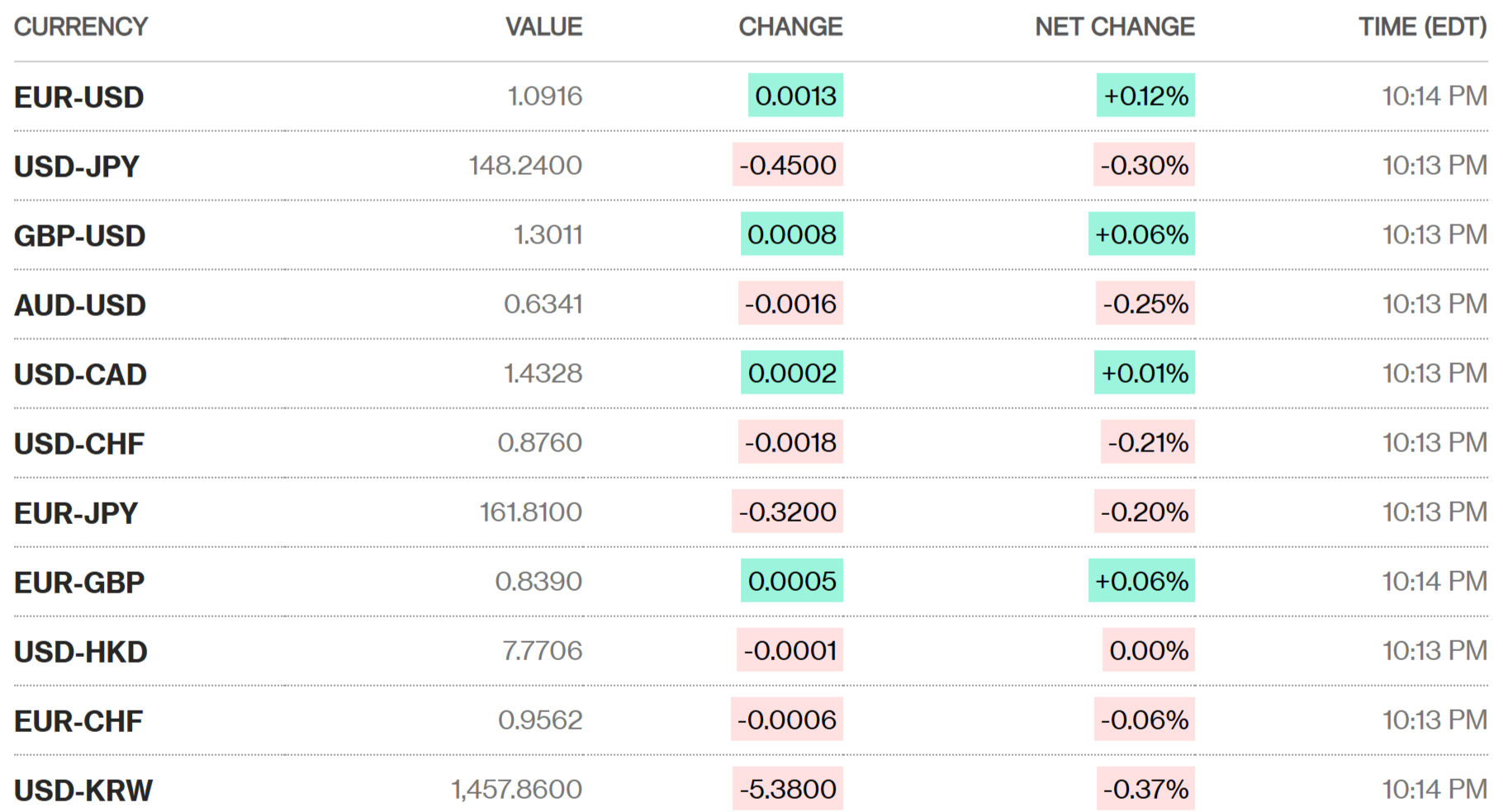 Chỉ số đô la Mỹ (DXY), đo lường biến động của bạc xanh so với 6 đồng tiền chủ chốt (EUR, JPY, GBP, CAD, SEK, CHF), hiện niêm yết ở mức 103,327, giảm 0,143 điểm so với thời điểm mở cửa.