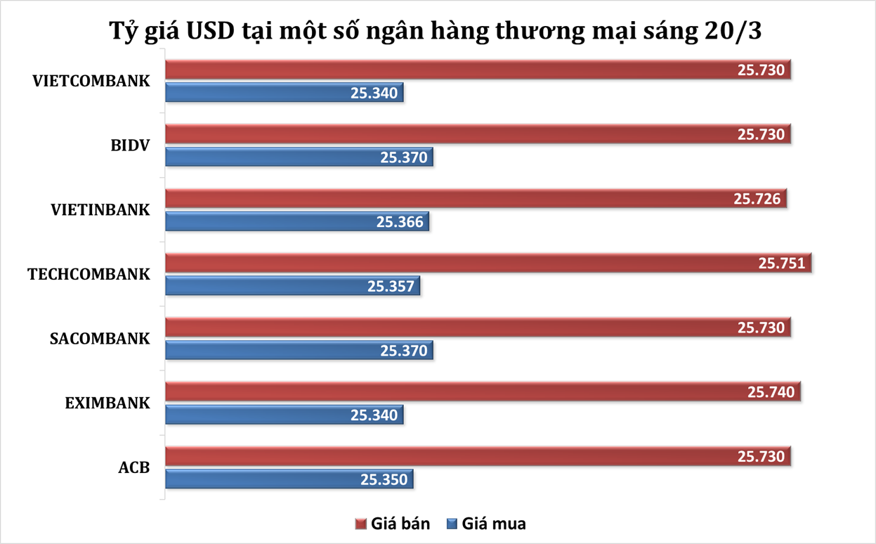 Trong khi đó, giá mua - bán USD tại hầu hết các ngân hàng thương mại được điều chỉnh tăng với biên độ phổ biến từ 5-20 đồng so với phiên trước.