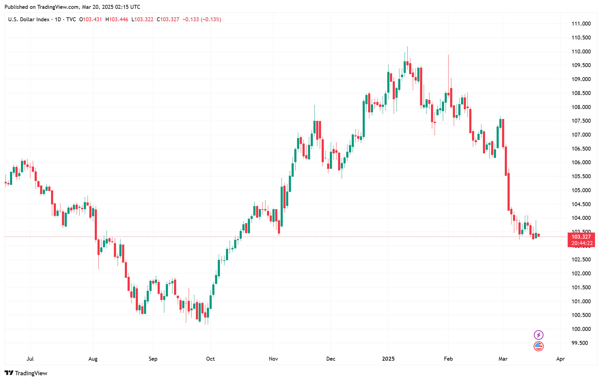 Đồng USD suy yếu sau khi Cục Dự trữ Liên bang Mỹ (Fed) giữ nguyên lãi suất ở mức 4,25-4,50% và dự báo sẽ có hai đợt cắt giảm 0,25 điểm phần trăm vào cuối năm nay, bất chấp bất ổn từ chính sách thuế quan của Tổng thống Mỹ Donald Trump.