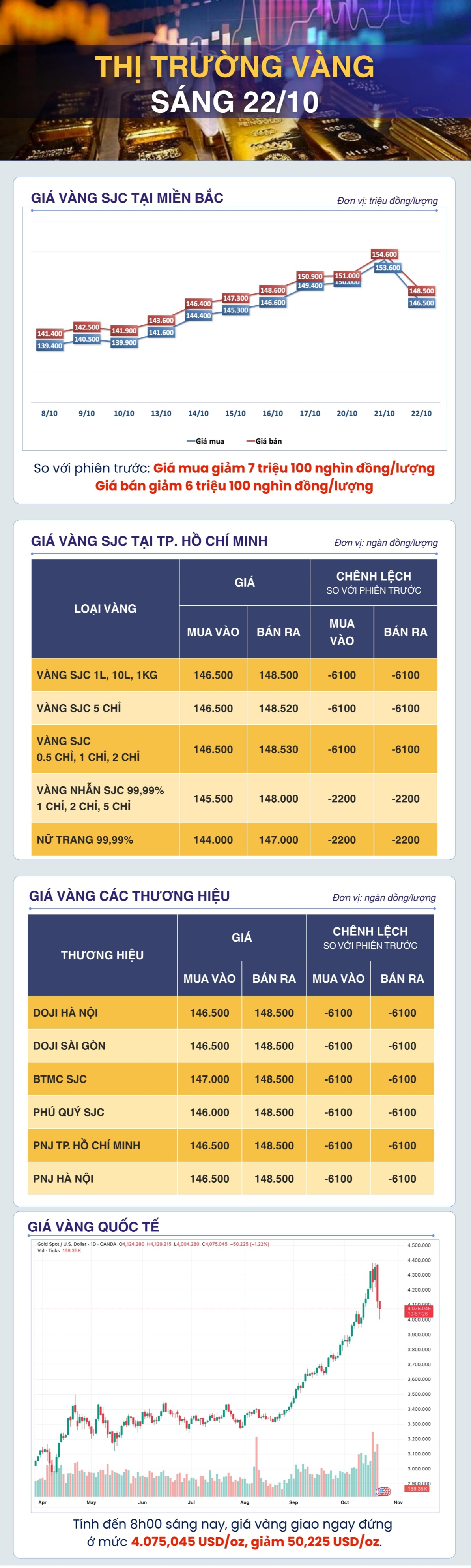 Trước đó, trong phiên thứ Hai (20/10), vàng đã lập đỉnh lịch sử mới ở mức 4.381,21 USD/oz, nâng tổng mức tăng trong năm nay lên khoảng 60%, được hỗ trợ bởi bất ổn địa chính trị - kinh tế toàn cầu, kỳ vọng cắt giảm lãi suất và lực mua bền bỉ từ các ngân hàng trung ương.