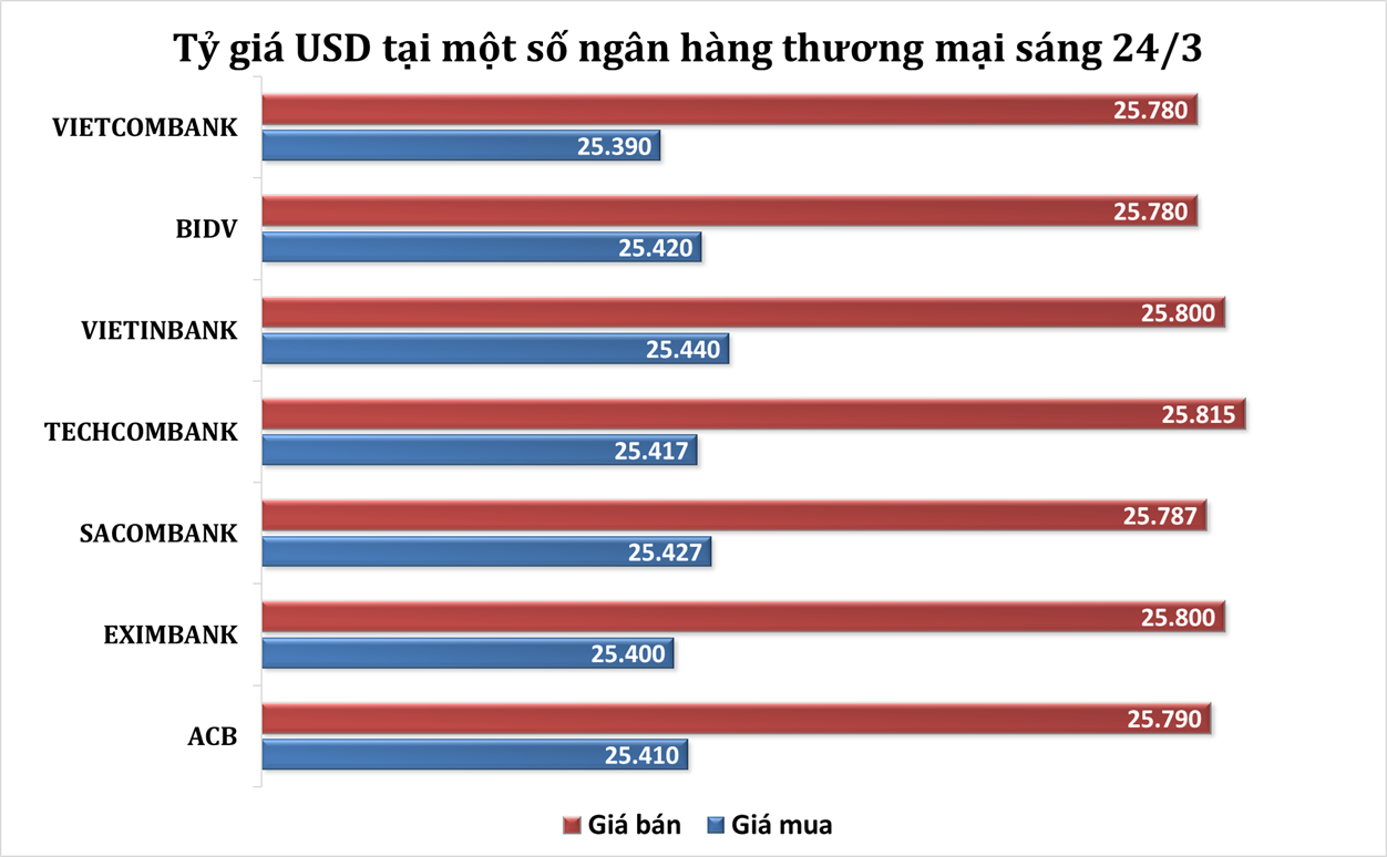 Trong khi đó, giá mua - bán USD tại tất cả các ngân hàng thương mại được điều chỉnh tăng với biên độ phổ biến từ 40-60 đồng so với phiên trước.