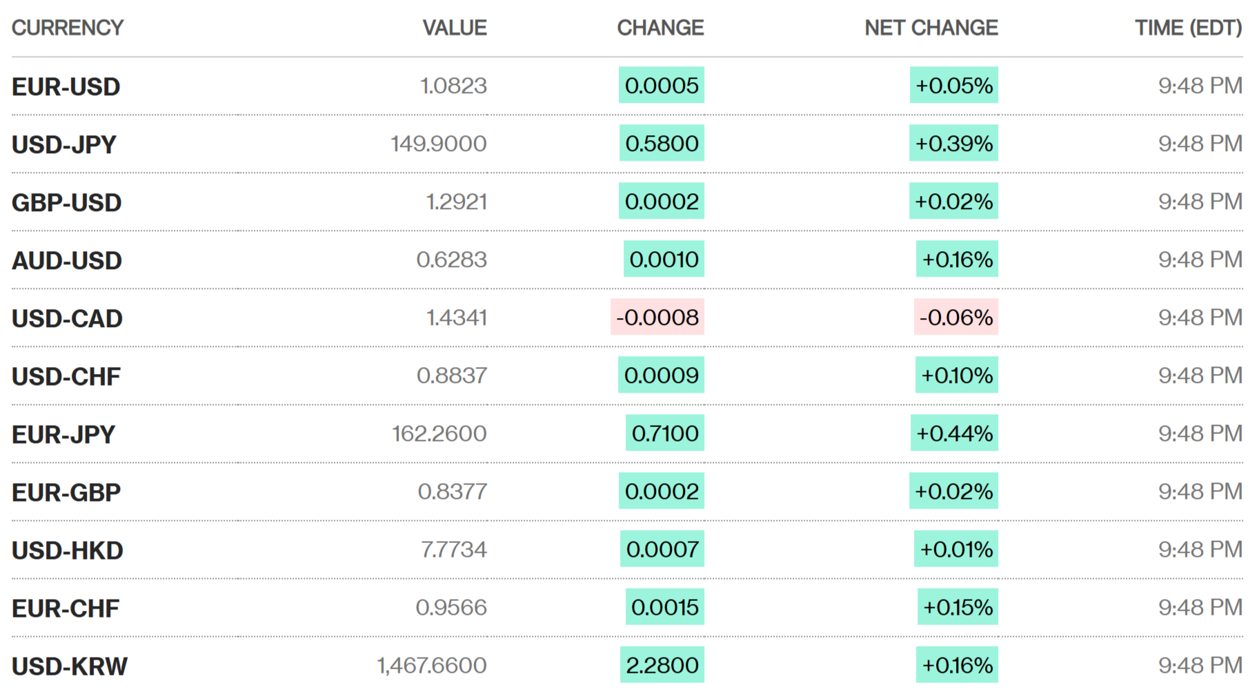 Lợi suất trái phiếu kho bạc Mỹ kỳ hạn 10 năm tăng 2,5 điểm cơ bản lên 4,2770%, hỗ trợ đồng USD tăng 0,39% so với đồng yên lên mức 149,90 yên đổi một UÚD, phản ánh xu hướng theo dõi lợi suất.