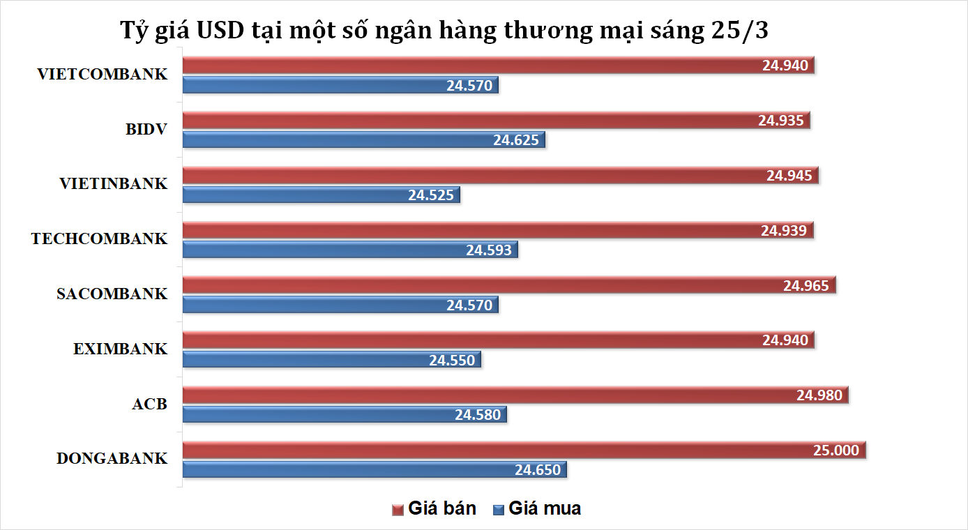 Cụ thể, tính đến 9h sáng nay, giá mua USD thấp nhất đang ở mức 24.525 VND/USD (thấp hơn 43 đồng), giá mua cao nhất đang ở mức 24.650 VND/USD. Ở chiều bán ra, giá bán thấp nhất đang ở mức 24.940 VND/USD (thấp hơn 10 đồng), giá bán cao nhất đang ở mức 25.000 VND/USD (thấp hơn 30 đồng).