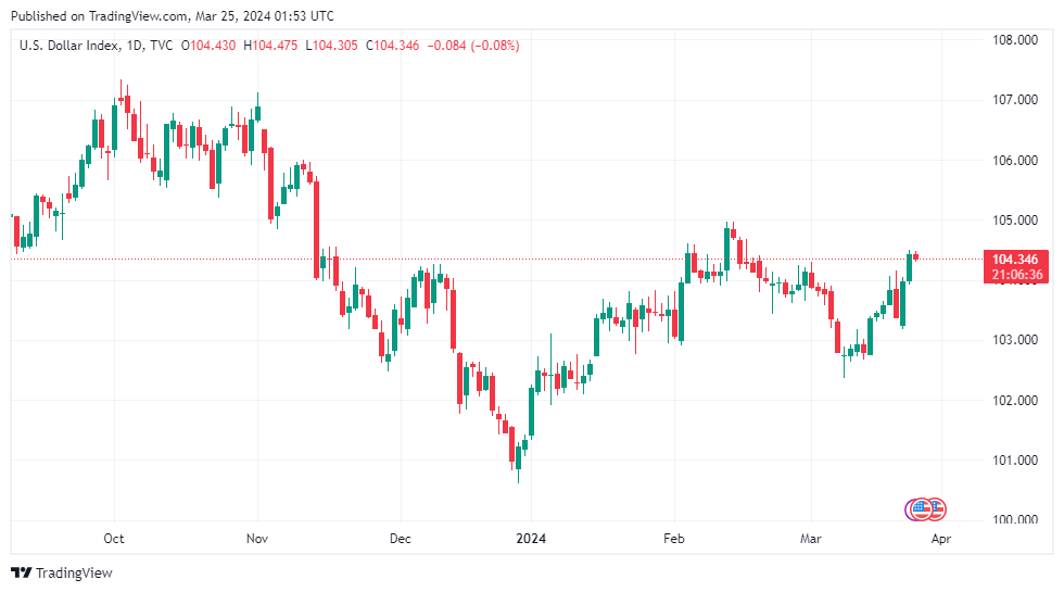 Chỉ số đô la Mỹ (DXY), đo lường biến động của bạc xanh so với 6 đồng tiền chủ chốt (EUR, JPY, GBP, CAD, SEK, CHF), hiện ở mức 104,346 điểm, giảm 0,084 điểm so với thời điểm mở cửa.