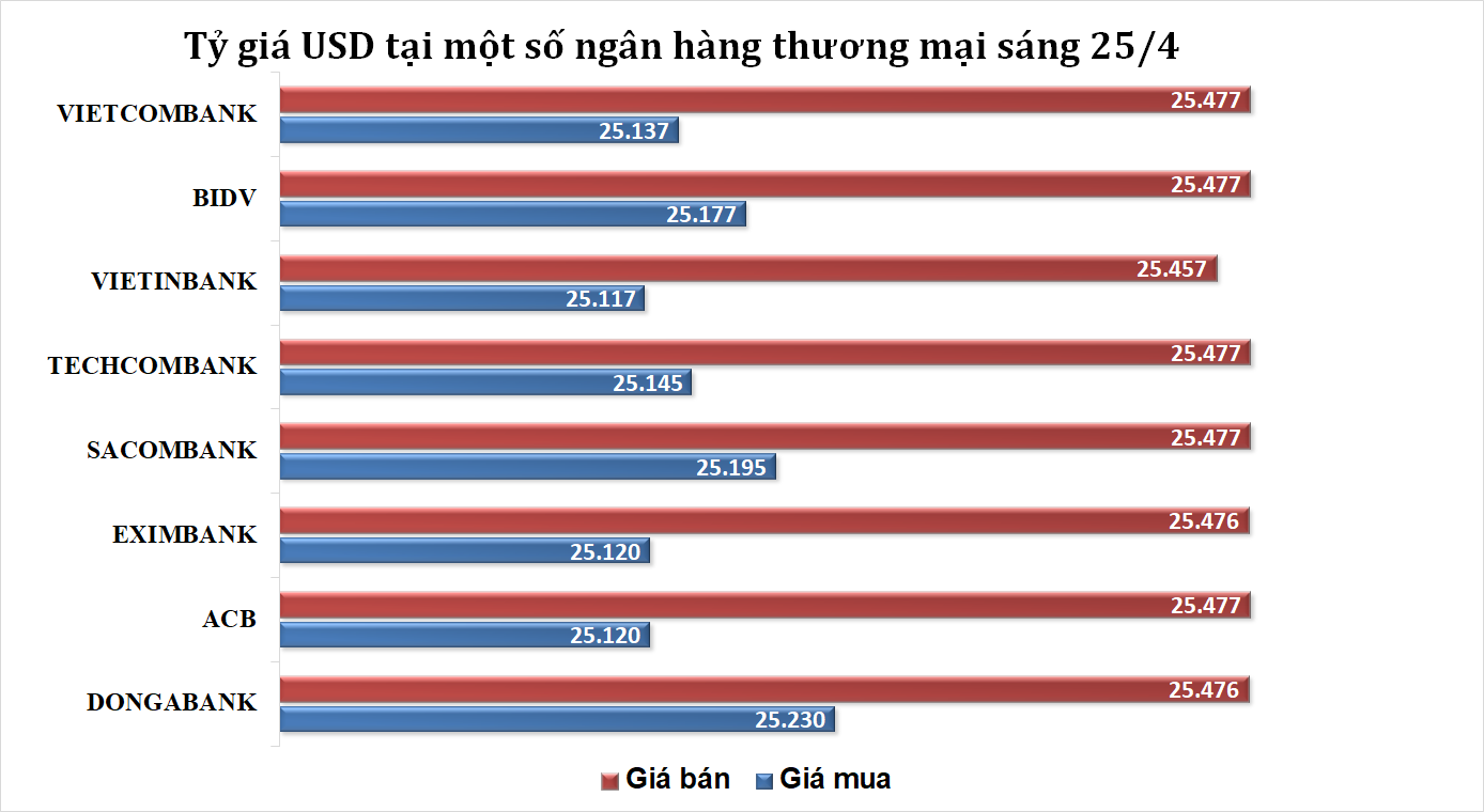 Cụ thể, tính đến 9h sáng nay, giá mua USD thấp nhất đang ở mức 25.117 VND/USD (thấp hơn 30 đồng), giá mua cao nhất đang ở mức 25.230 VND/USD (thấp hơn 30 đồng). Ở chiều bán ra, giá bán được hầu hết các ngân hàng đồng loạt niêm yết ở mức 25.477 VND/USD (thấp hơn 10 đồng).