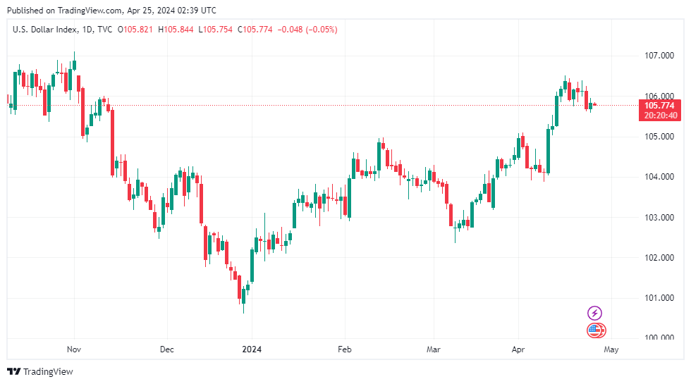 Chỉ số đô la Mỹ (DXY), đo lường biến động của bạc xanh so với 6 đồng tiền chủ chốt (EUR, JPY, GBP, CAD, SEK, CHF), hiện ở mức 105,774 điểm, giảm 0,046 điểm so với thời điểm mở cửa.