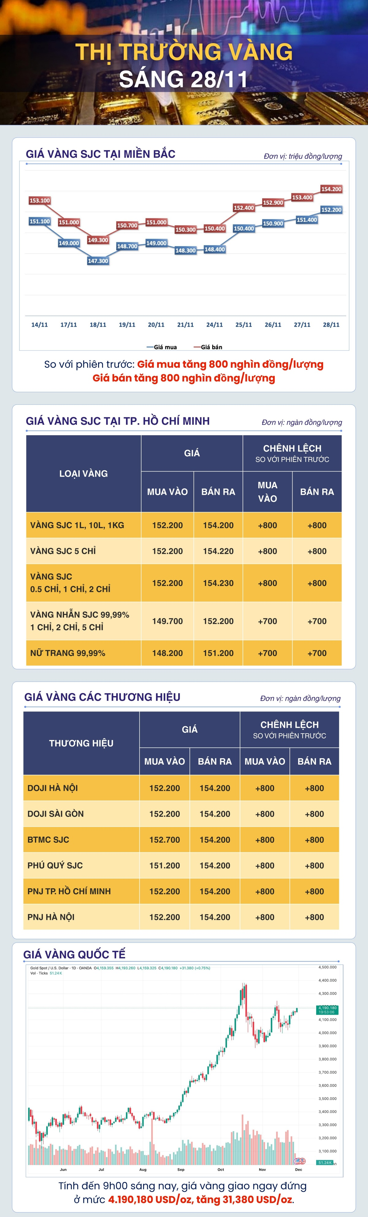 Tính đến cuối phiên, vàng giao ngay giảm 0,2% xuống 4.157,29 USD/oz vào lúc 16:01 GMT. Giá vàng tương lai tháng 12 của Mỹ cũng giảm 0,2%, xuống 4.154,30 USD/oz.