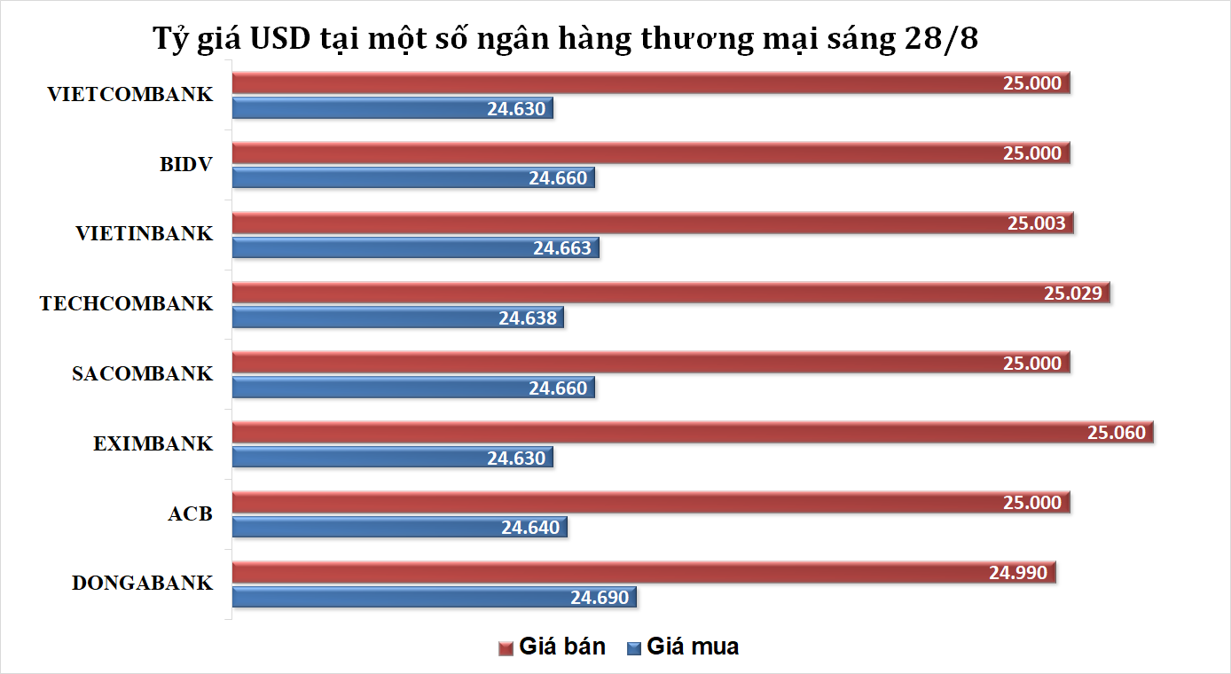 Trong khi đó, giá mua - bán USD tại tất cả các ngân hàng được điều chỉnh giảm với biên độ phổ biến từ 20-40 đồng so với phiên trước.
