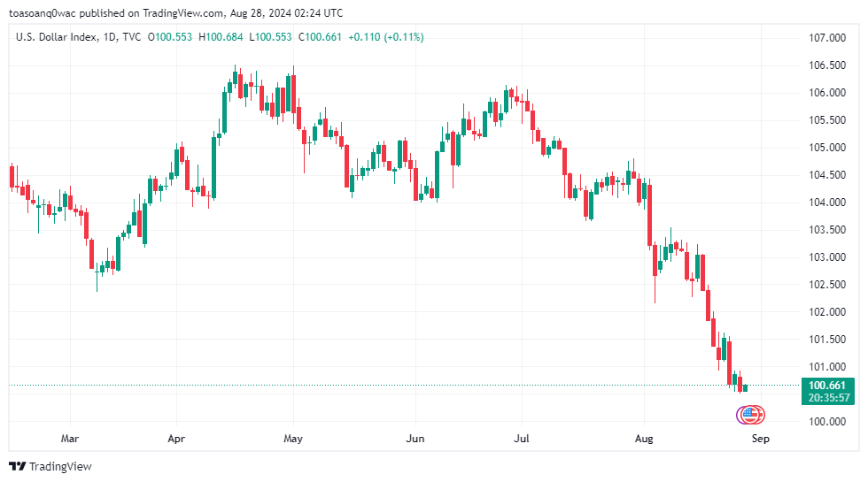 Chỉ số đô la Mỹ (DXY), đo lường biến động của bạc xanh so với 6 đồng tiền chủ chốt (EUR, JPY, GBP, CAD, SEK, CHF), hiện ở mức 100,661 điểm, tăng 0,111 điểm so với thời điểm mở cửa.