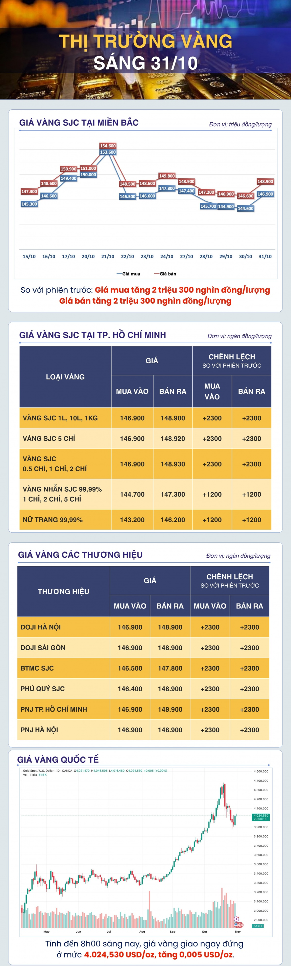 Chốt phiên hôm qua, giá vàng giao ngay tăng 1,9% lên 4.003,62 USD/oz, trong khi giá vàng tương lai tháng 12 chốt phiên tăng 0,4%, đạt 4.015,9 USD/oz.