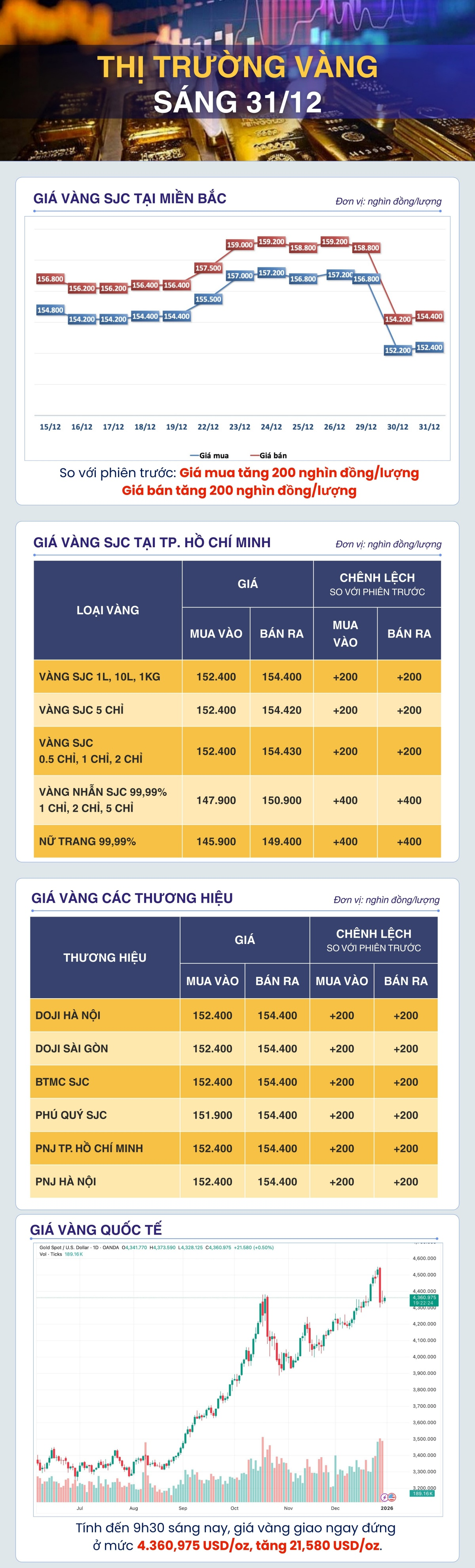 Sáng 31/12: Giá vàng thế giới tiếp đà tăng nhẹ