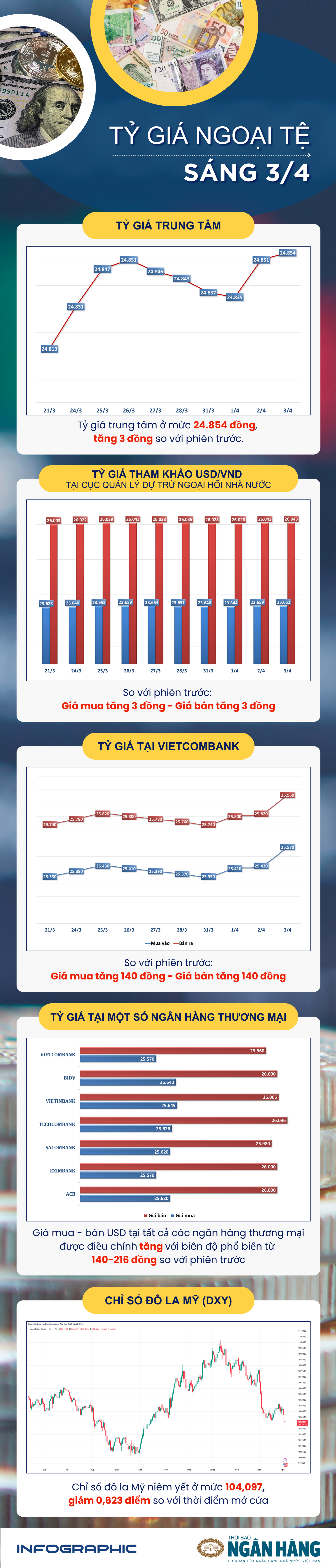 Sáng 3/4: Tỷ giá trung tâm tăng 3 đồng