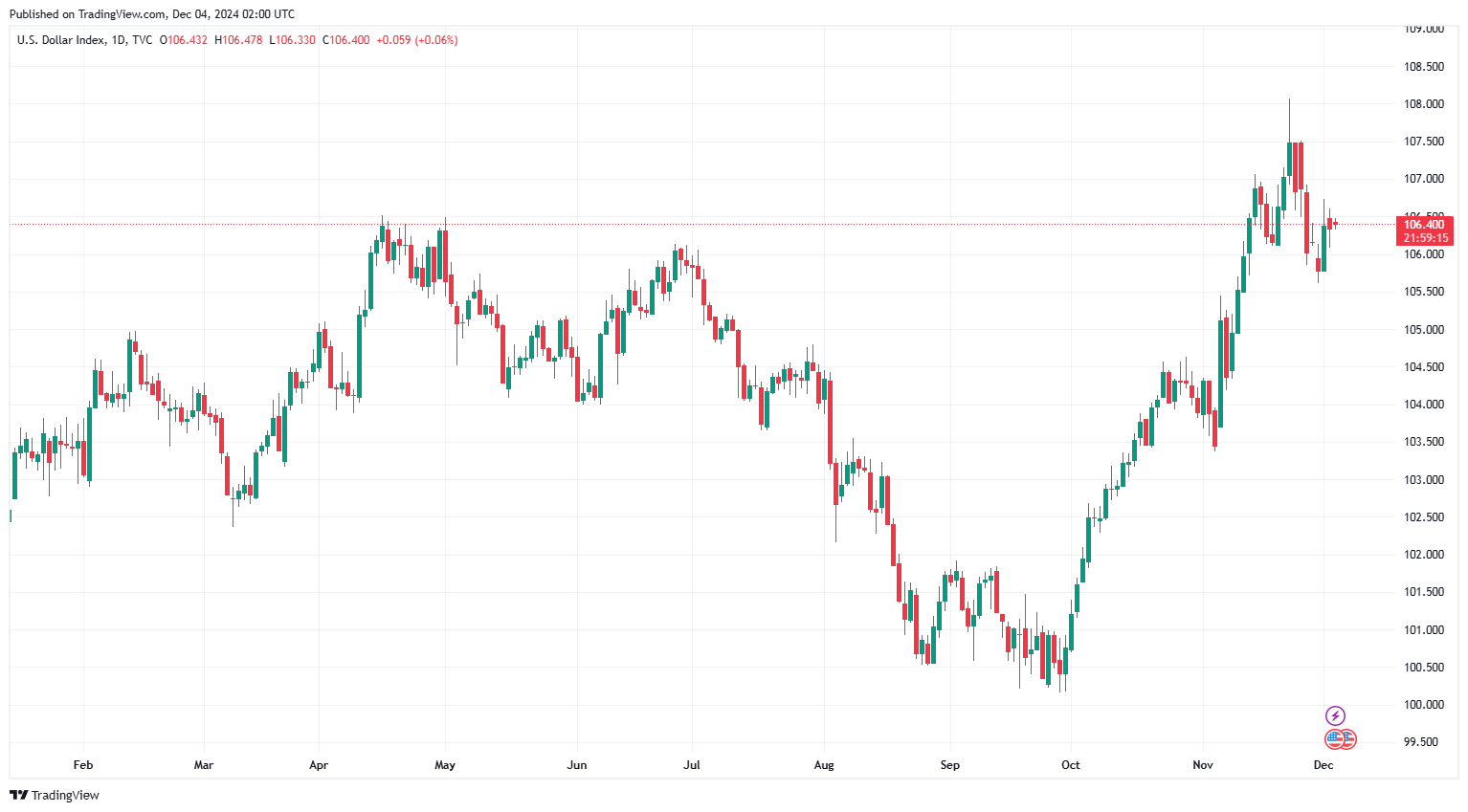 Chỉ số đô la Mỹ (DXY), đo lường biến động của bạc xanh so với 6 đồng tiền chủ chốt (EUR, JPY, GBP, CAD, SEK, CHF), hiện ở mức 106,400 điểm, giảm 0,03 điểm so với thời điểm mở cửa.