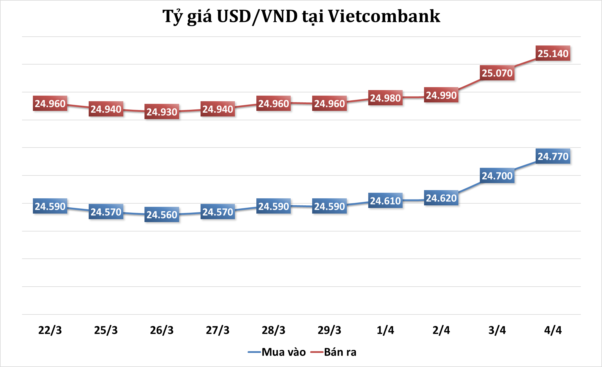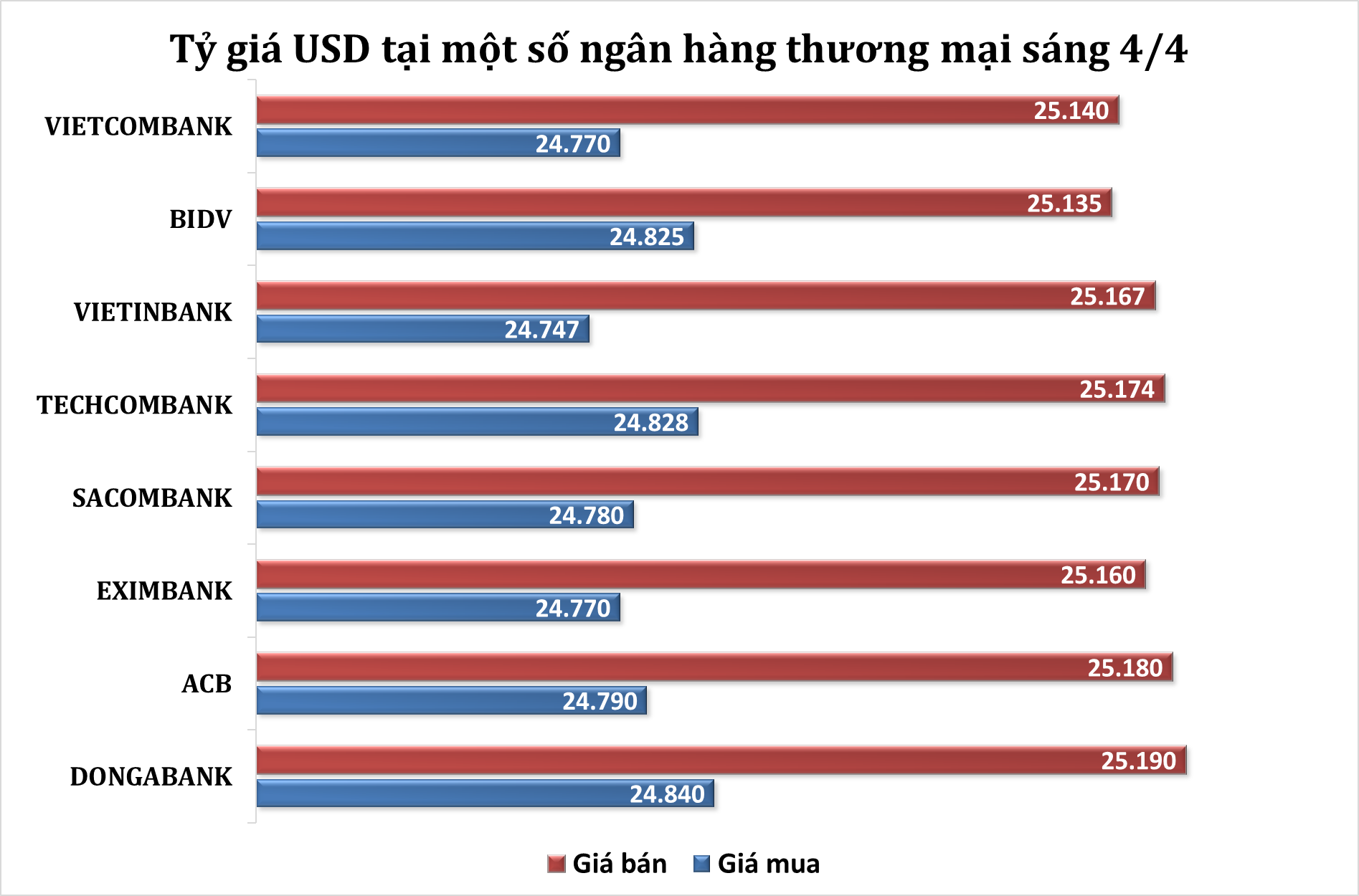 Cụ thể, tính đến 9h sáng nay, giá mua USD thấp nhất đang ở mức 24.747 VND/USD (cao hơn 64 đồng), giá mua cao nhất đang ở mức 24.840 VND/USD (cao hơn 60 đồng). Ở chiều bán ra, giá bán thấp nhất đang ở mức 25.135 VND/USD (cao hơn 65 đồng), giá bán cao nhất đang ở mức 25.190 VND/USD (cao hơn 70 đồng).