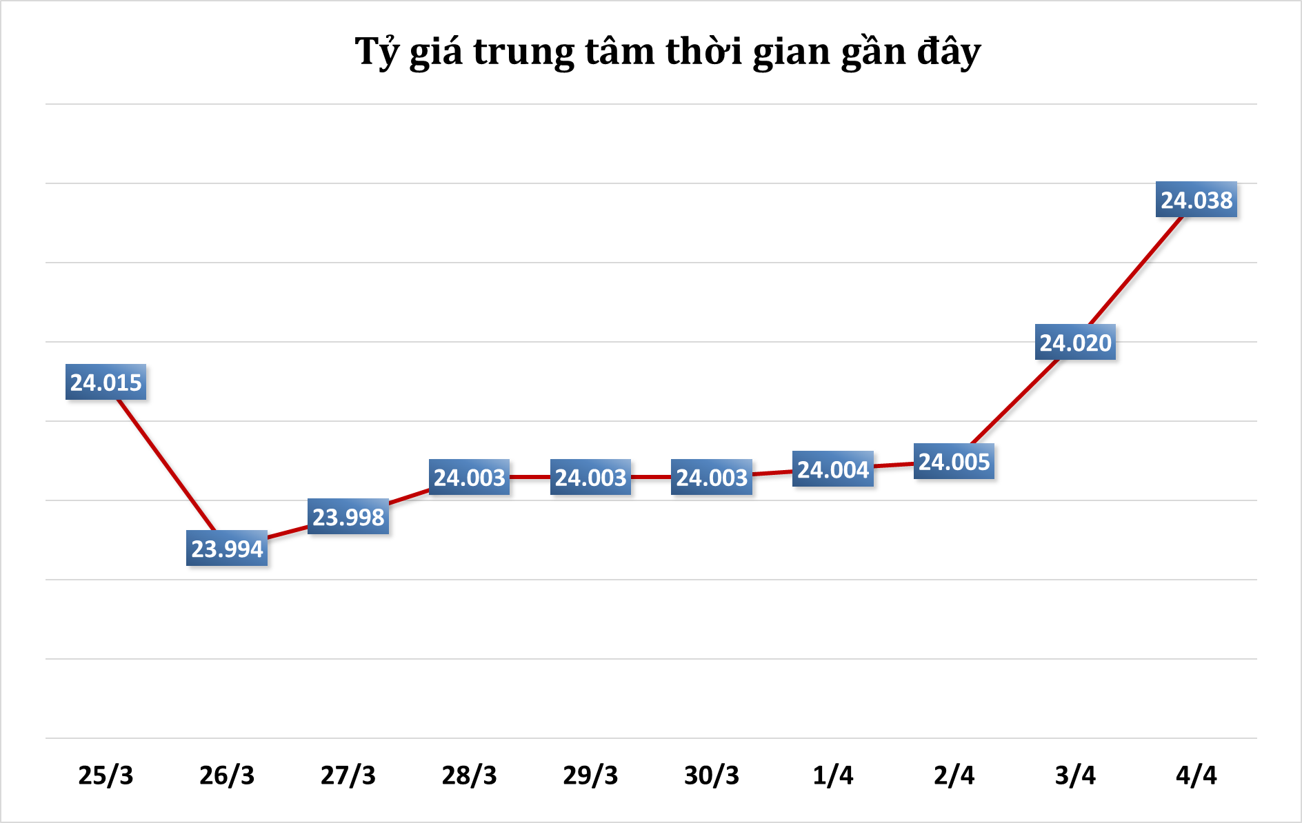 Ngân hàng Nhà nước sáng nay niêm yết tỷ giá trung tâm ở mức 24.038 đồng, tăng 18 đồng so với phiên trước.