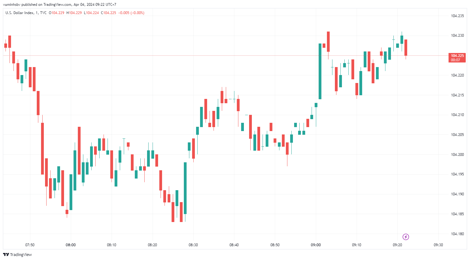 Chỉ số đô la Mỹ (DXY), đo lường biến động của bạc xanh so với 6 đồng tiền chủ chốt (EUR, JPY, GBP, CAD, SEK, CHF), hiện ở mức 104,225 điểm, giảm nhẹ 0,005 điểm so với thời điểm mở cửa.