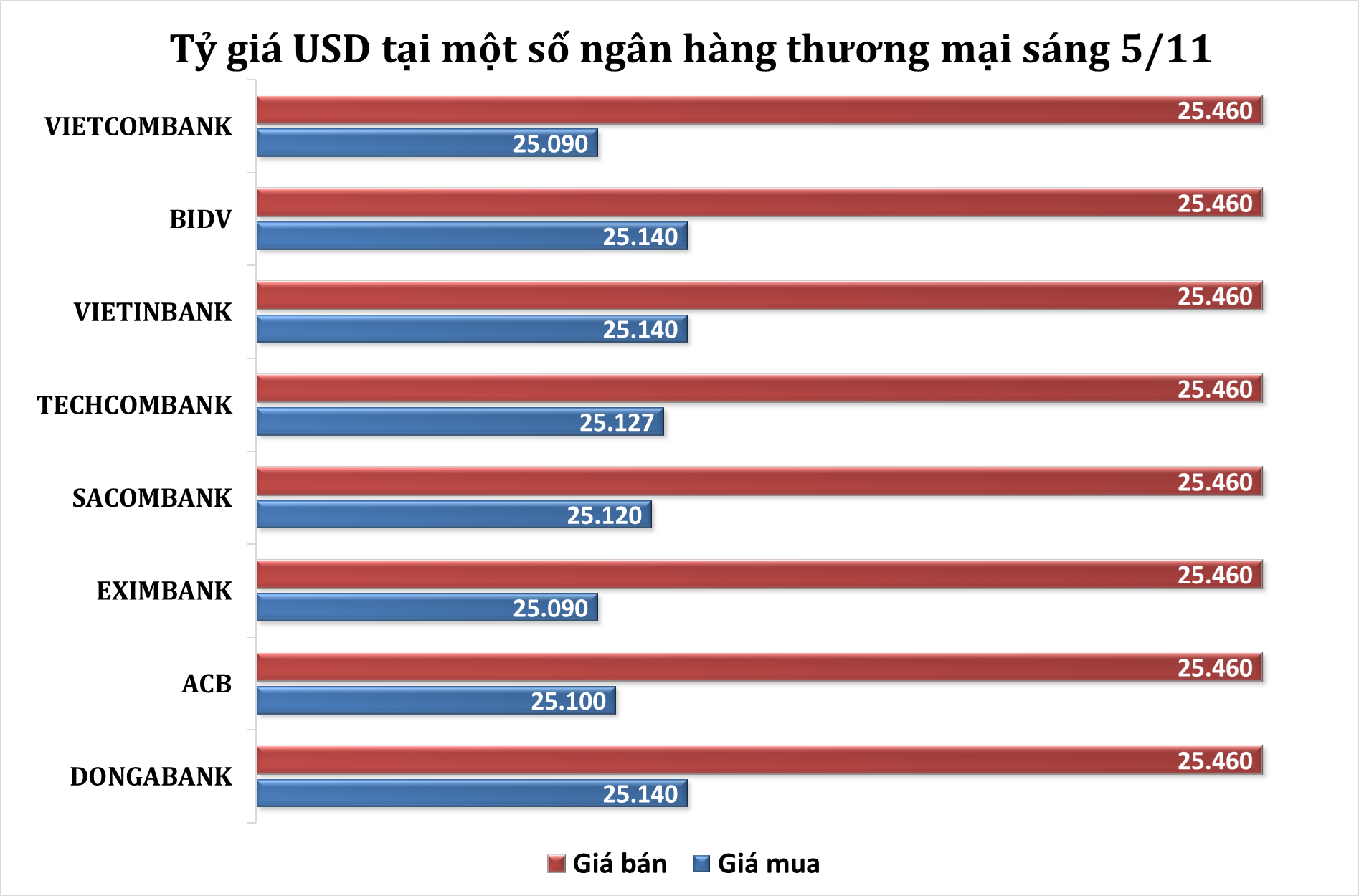 Cụ thể, tính đến 9h sáng nay, giá mua USD thấp nhất đang ở mức 25.090 VND/USD (thấp hơn 5 đồng), giá mua cao nhất đang ở mức 25.140 VND/USD (cao hơn 15 đồng). Ở chiều bán ra, giá bán USD được tất cả các ngân hàng đồng loạt niêm yết ở mức 25.460 đồng/USD (thấp hơn 5 đồng).