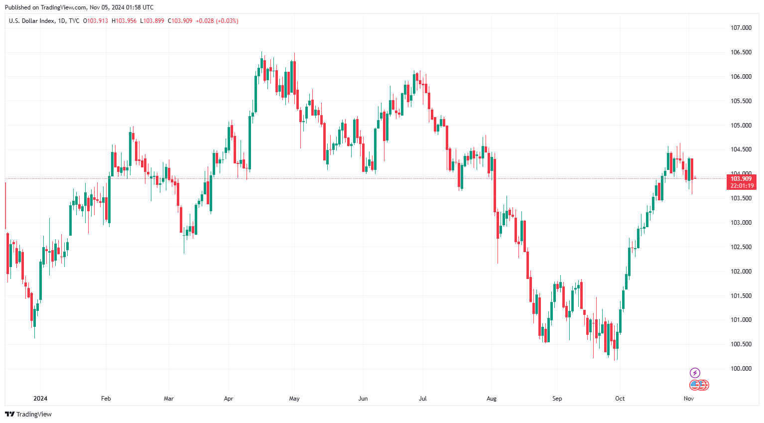 Chỉ số đô la Mỹ (DXY), đo lường biến động của bạc xanh so với 6 đồng tiền chủ chốt (EUR, JPY, GBP, CAD, SEK, CHF), hiện ở mức 103,909 điểm, giảm 0,001 điểm so với thời điểm mở cửa.